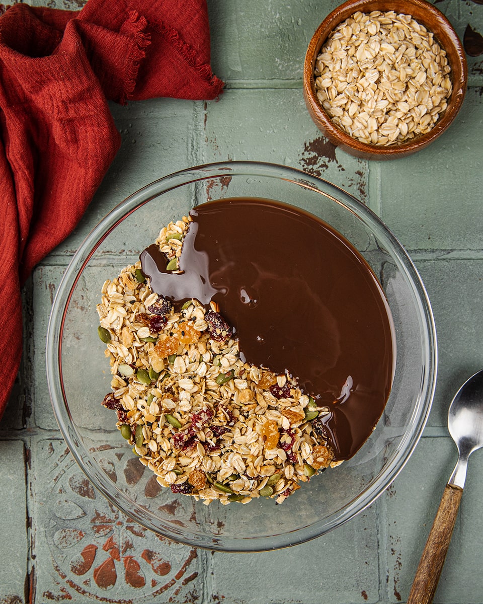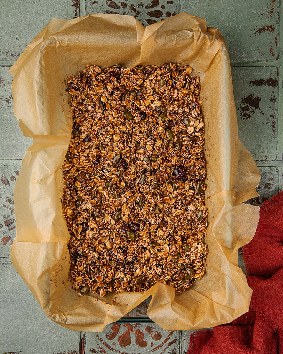 В сотейнике соединить сгущенное молоко с какао со сливочным маслом и ванильным сахаром. Нагреть, не доводя до кипения. Соединить овсяные хлопья, вишню, рубленные орехи, тыквенные семечки, кунжут и изюм. Залить сгущенно-масляной массой, перемешать.