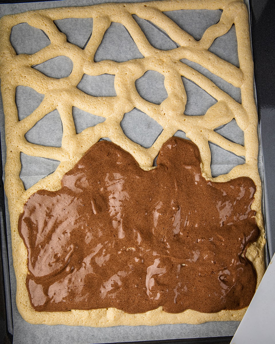 Когда рисунок пропечётся, достать противень с ним из духовки и аккуратно вылить сверху шоколадное тесто, разровняв его по всей поверхности. Так как предварительно белый рисунок уже пропёкся, то он не смажется и получится чётким. Выпекать бисквит в духовке ещё в течение 10 минут. Готовый бисквит ещё горячим свернуть в рулет и оставить остывать.