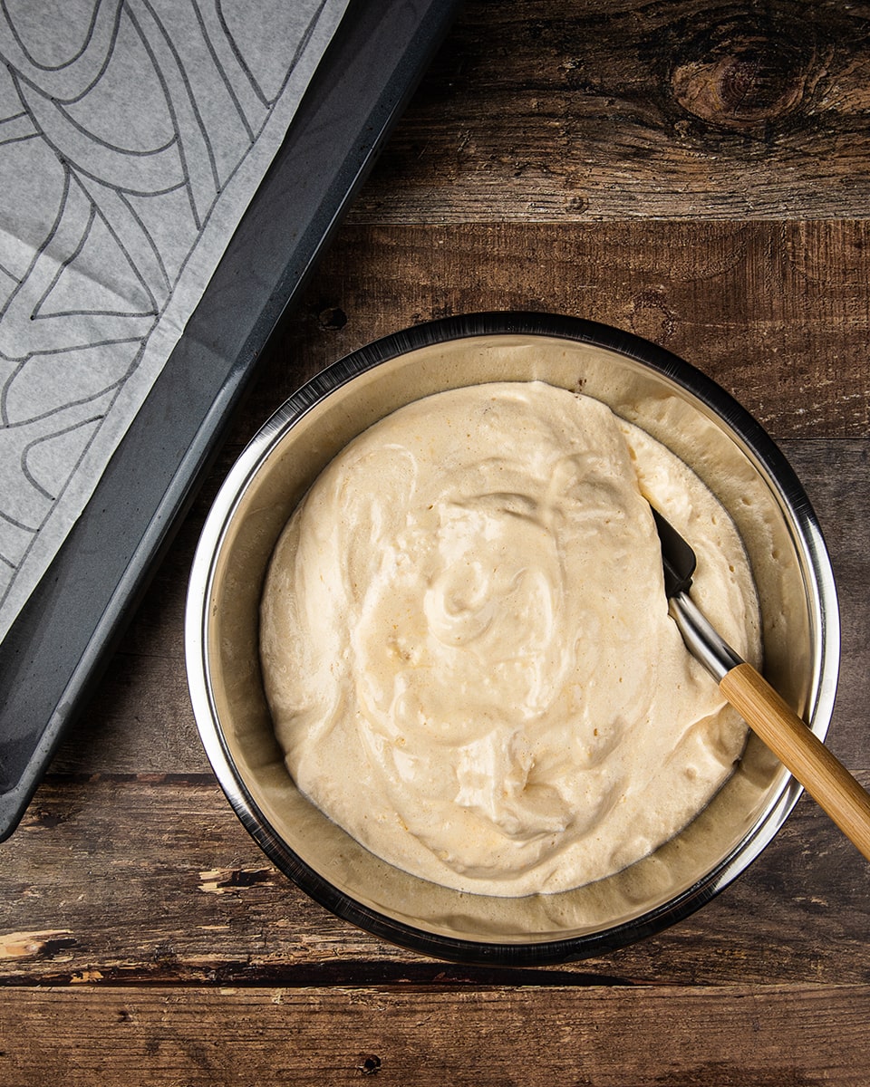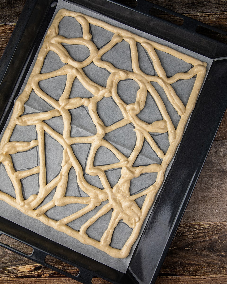 Половину теста выложить в кондитерский мешок и нанести узор по разметке. Духовку заранее прогреть до 180°С и запечь противень с бисквитным рисунком в течение 4 минут.