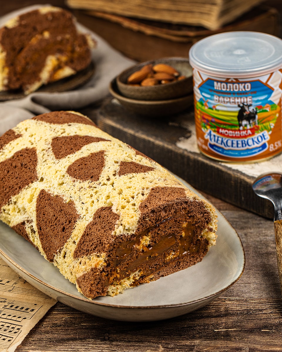 Для приготовления крема, мягкое сливочное масло слегка взбить, а затем ввести в него варёное сгущённое молоко и взбить до получения однородного крема. Готовый крем можно слегка охладить в холодильнике. Когда бисквит остынет, его необходимо слегка развернуть и промазать внутри кремом, а затем снова свернуть в рулет. Отправить рулет на 2 часа в холодильник.