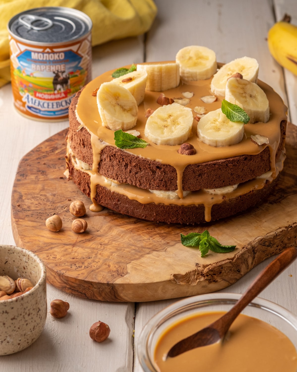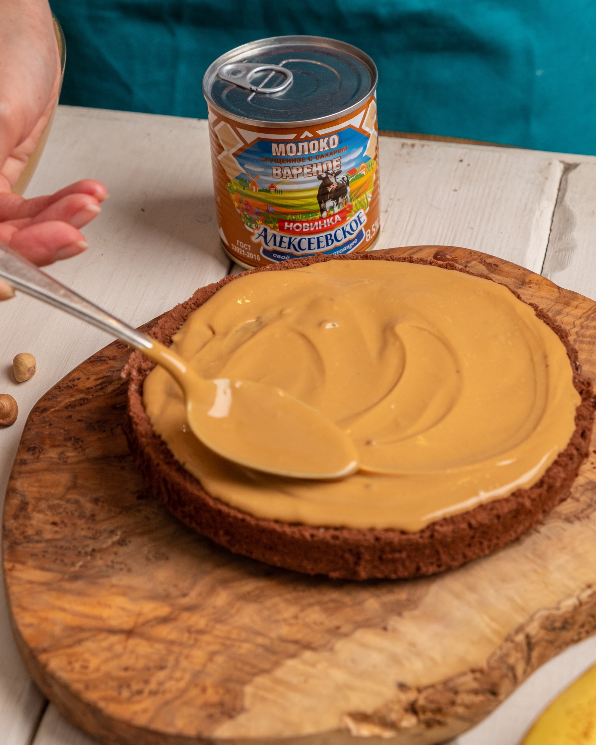 Бисквитный торт с кремом из сгущенного молока и сметаны с бананами