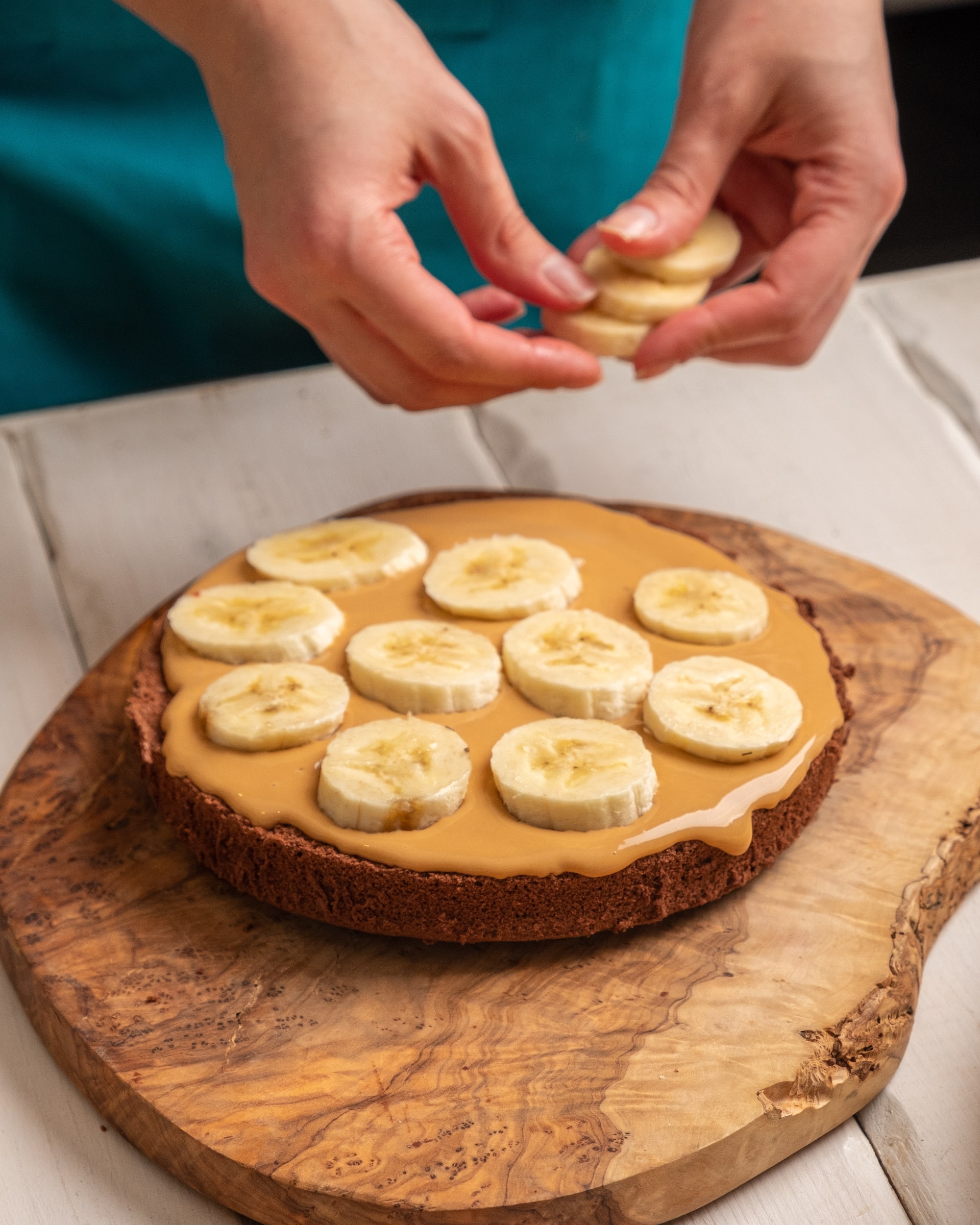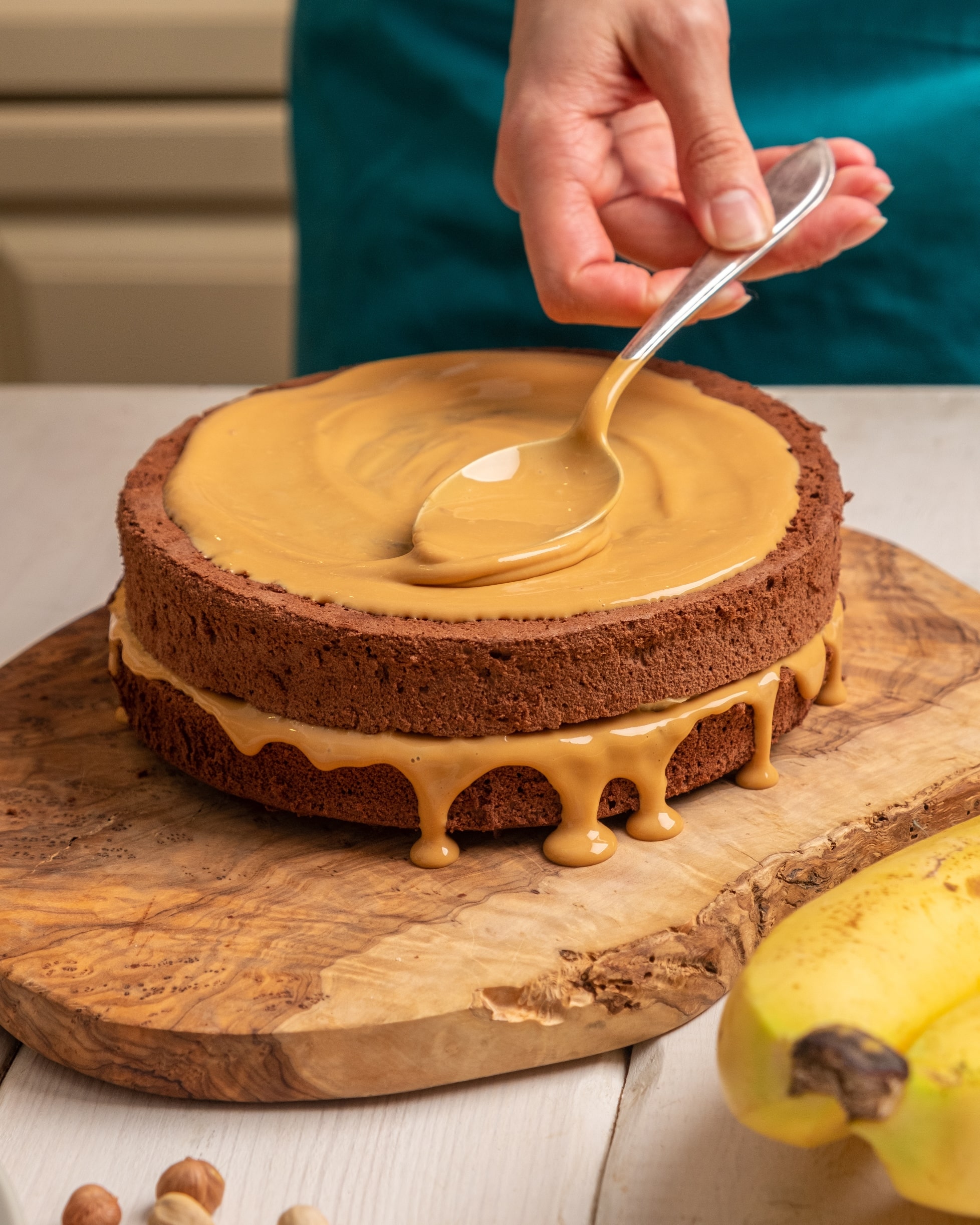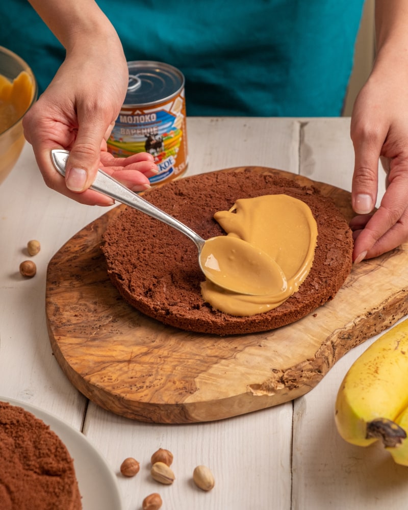 Сборка: нижний корж смажьте кремом, положите второй, снова смажьте кремом, сделайте слой из бананов. Закройте последним коржом.