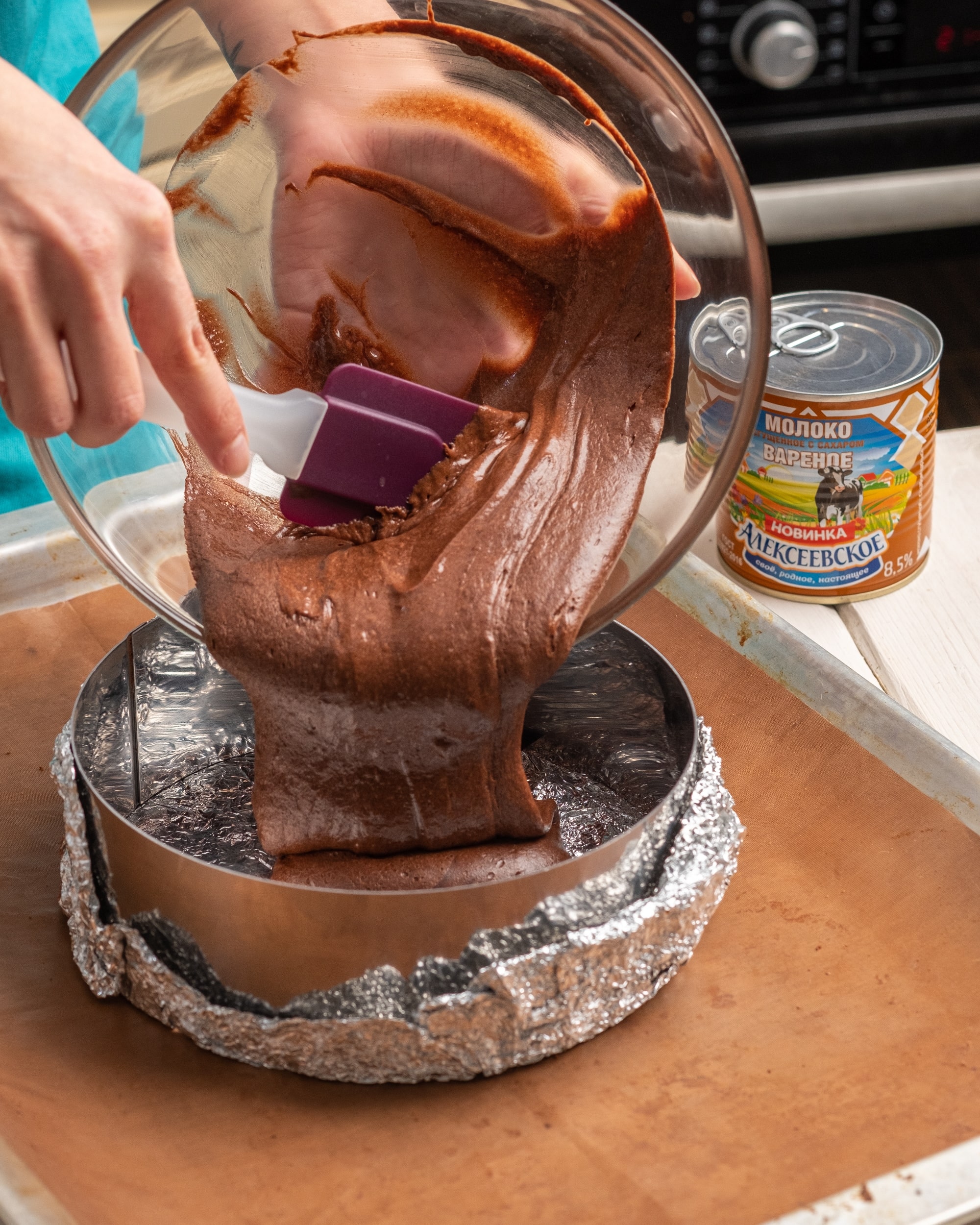 Форму для запекания (лучше раздвижную) проложить пергаментом, вылить 1/3 теста.