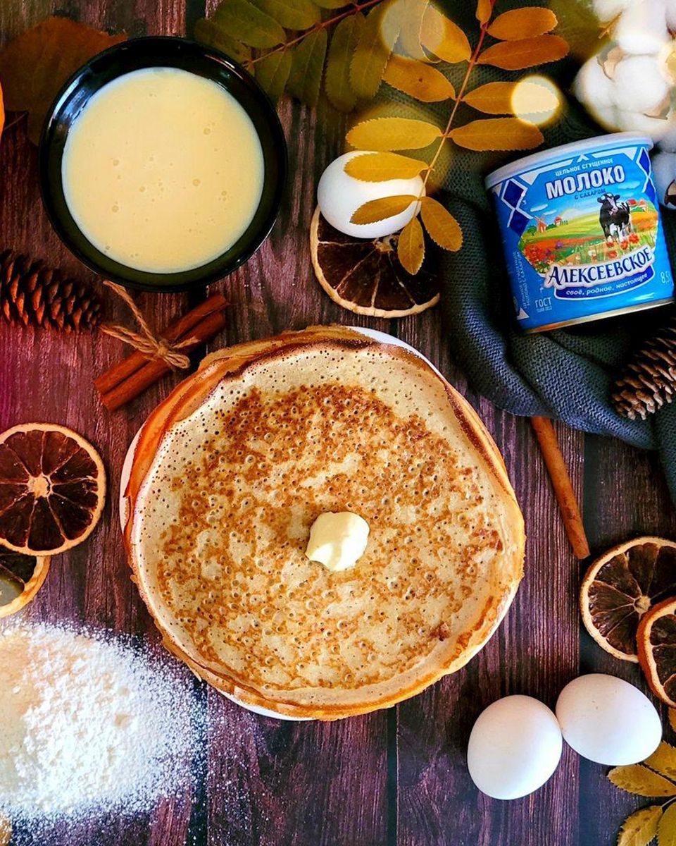 Блинчики получаются нежными и вкусными. Ещё горячие смазывать сливочным маслом. Подавать лучше со сгущенным молоком «Алексеевское».
