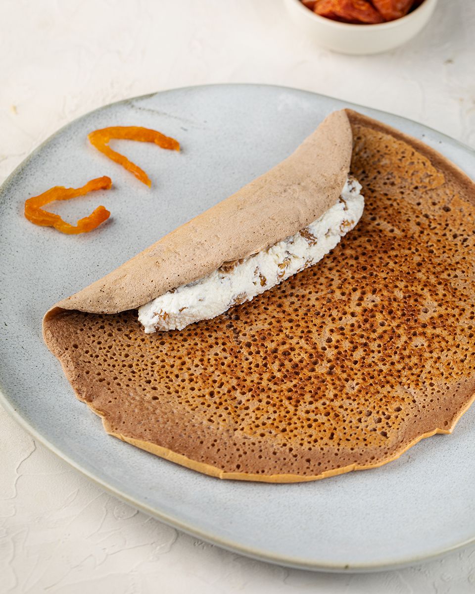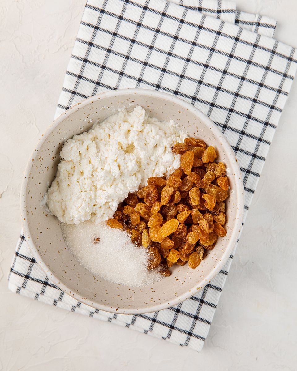 Приготовить начинку. Изюм и курагу ошпарить кипятком. Курагу нарезать кубиками. Соединить творог, изюм, курагу, сахар, сметану, ванилин и перемешать.
