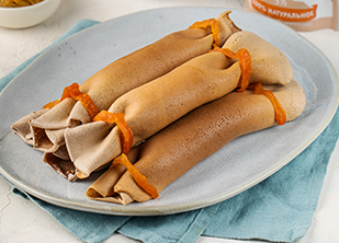 На каждый блинчик выложить начинку и свернуть рулетиком.