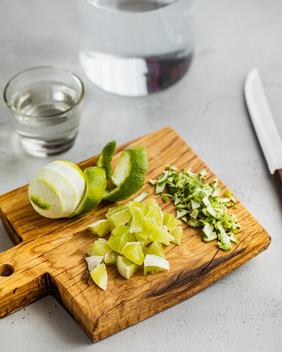 Лаймы хорошенько помыть под горячей водой. Срежьте концы, нарежьте их на кусочки, порежьте с кожурой и удалите семечки — иначе они придадут горечь.