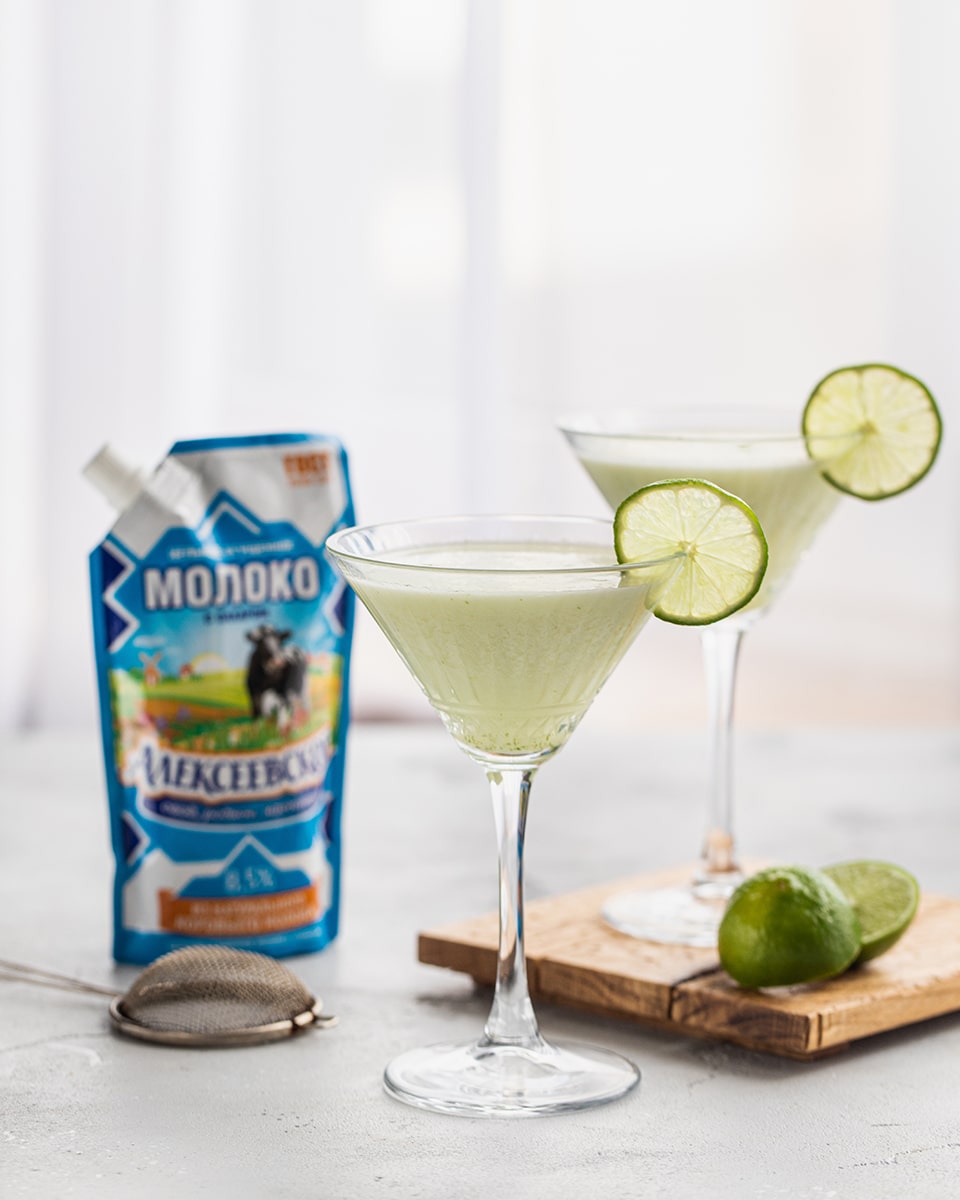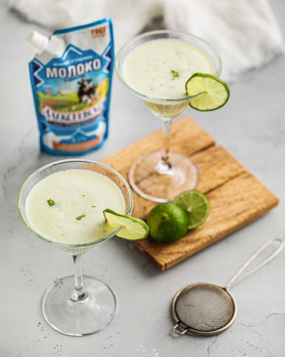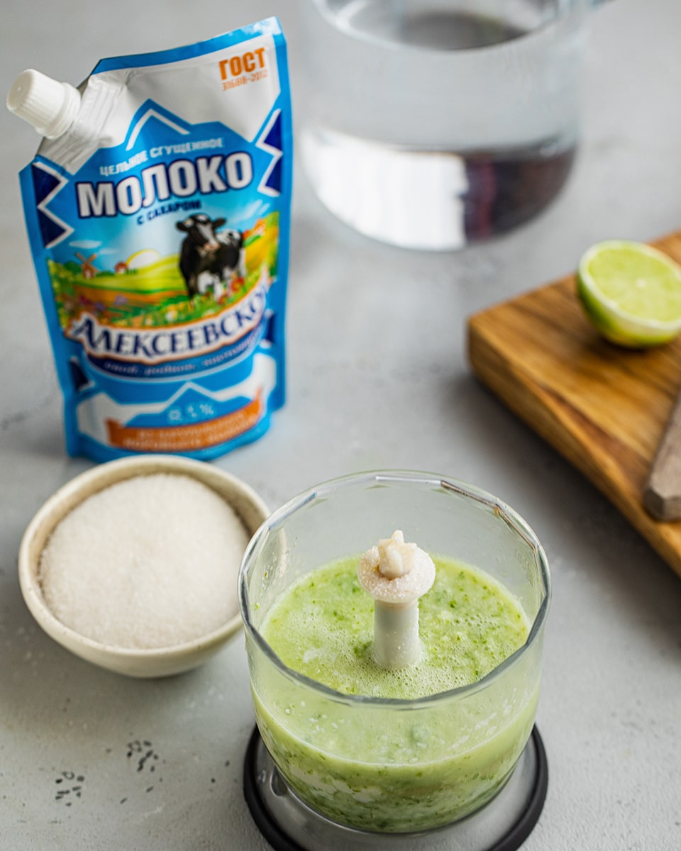 В стакане блендера соедините лаймы, сахар, сгущённое молоко и воду. Взбейте все ингредиенты блендером до однородности.