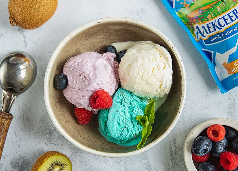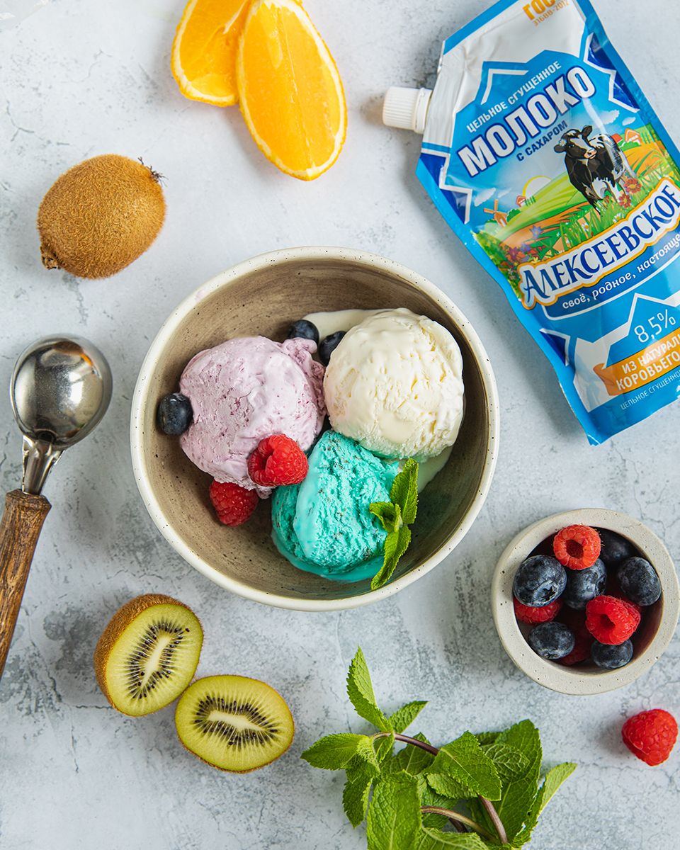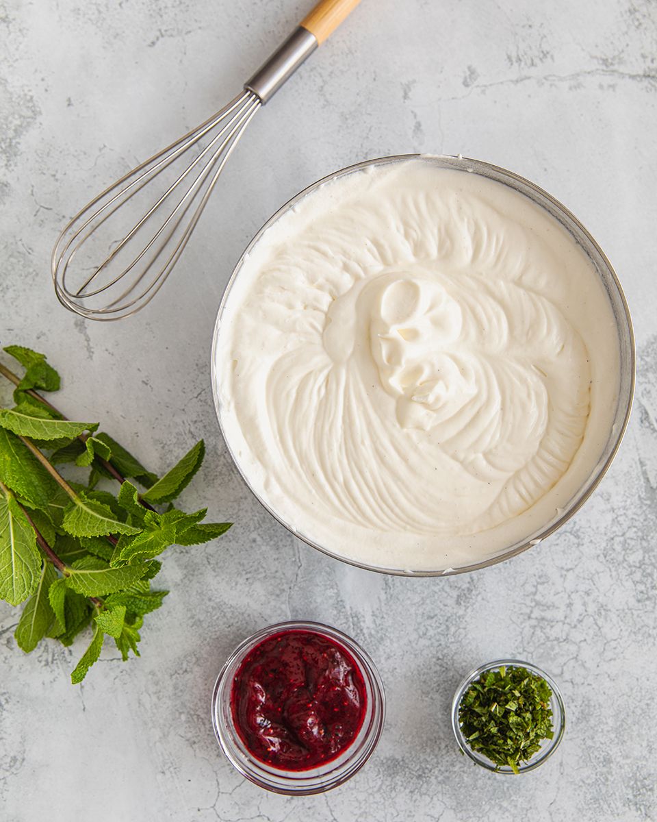 Разделить сливочную заготовку на 3 части, одну можно сразу поставить застывать в морозильную камеру. В другую добавить ягодное пюре (заранее процедить от косточек если есть), в третью часть добавить мелко нарубленную мяту, если захотите добавить более яркий цвет помимо освежающего мятного вкуса, можно добавить немного зелёного гелиевого пищевого красителя, тщательно перемешать оба вида, также убрать в морозилку.