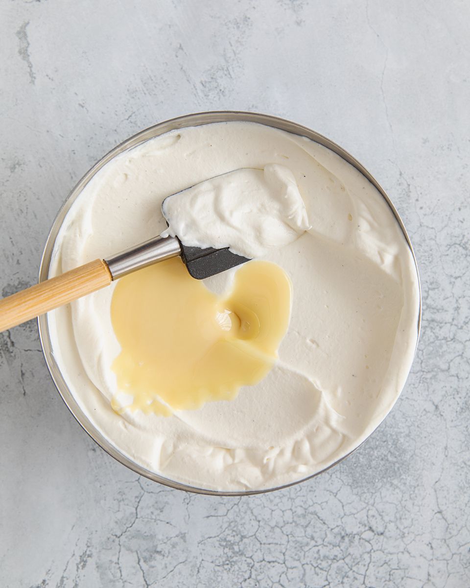Сливки обязательно должны быть холодные. В охлаждённые сливки добавить ванильный сахар, взбить миксером на высокой скорости. Постепенно добавить сгущённое молоко и продолжать взбивать, но на скорости поменьше. Взбивать до получения кремообразной смеси.
