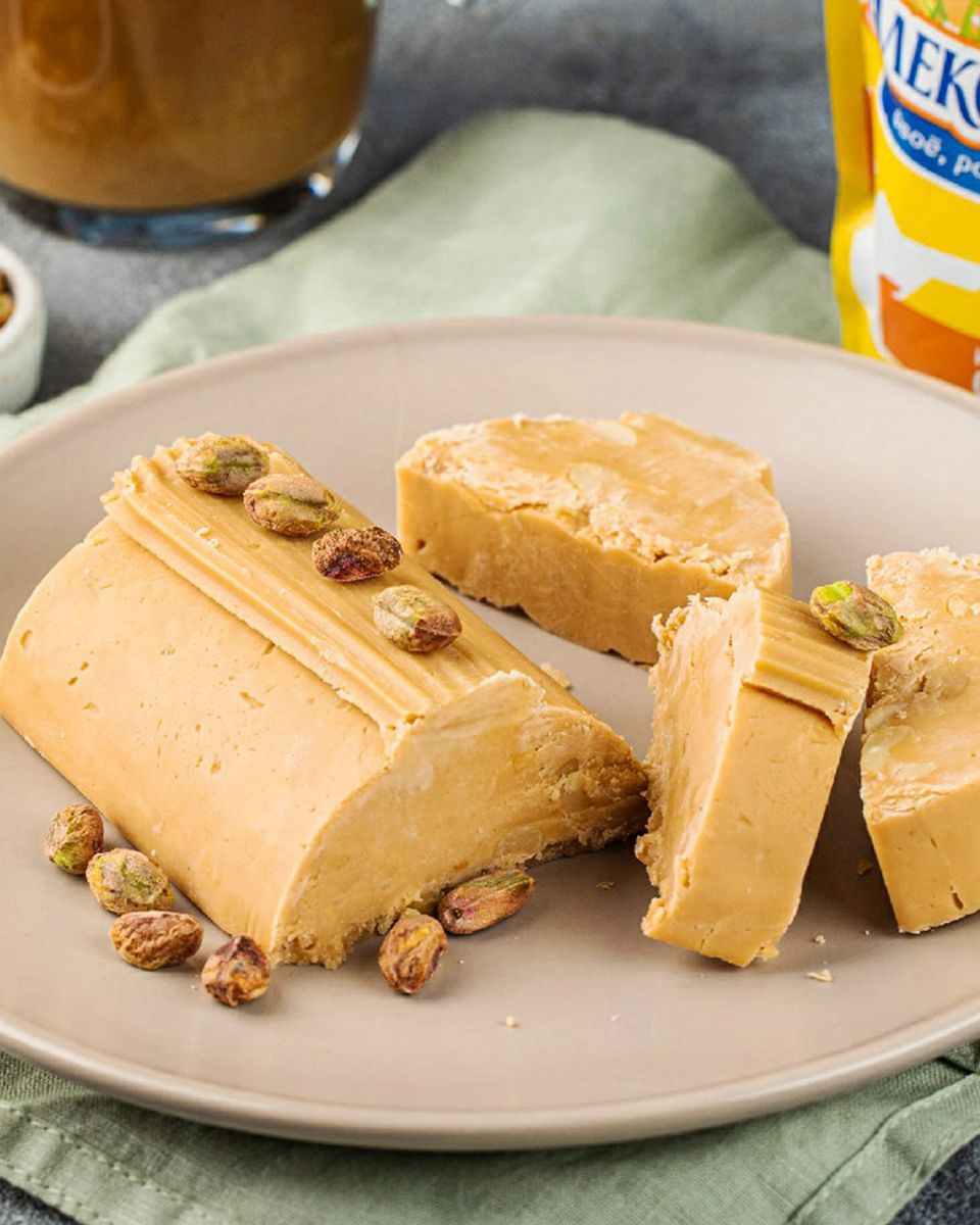 По желанию во внутрь шербета можно добавить орехи, для этого необходимо немного нагреть его на минимальном огне (не выше 50°С). Добавить орехи, перемешать и выложить в прямоугольную форму, застеленную пищевой пленкой. Дать застыть. Или можно украсить орехами уже готовый шербет.