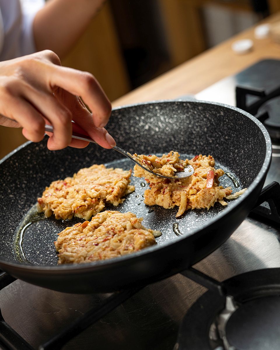 На сковороде разогреть растительное масло. Отпекать по ложке смеси с двух сторон до хрустящей корочки.