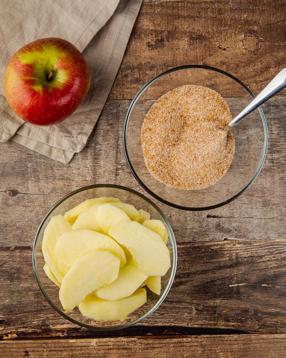 Яблоки вымыть, очистить их от семян и нарезать дольками. На плите разогреть сковороду со сливочным маслом. Выложить яблоки, сахар, корицу и кардамон. Готовить, помешивая, до мягкости (около 5-8 минут).