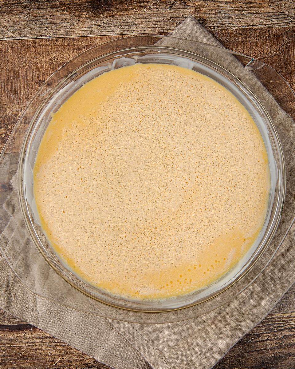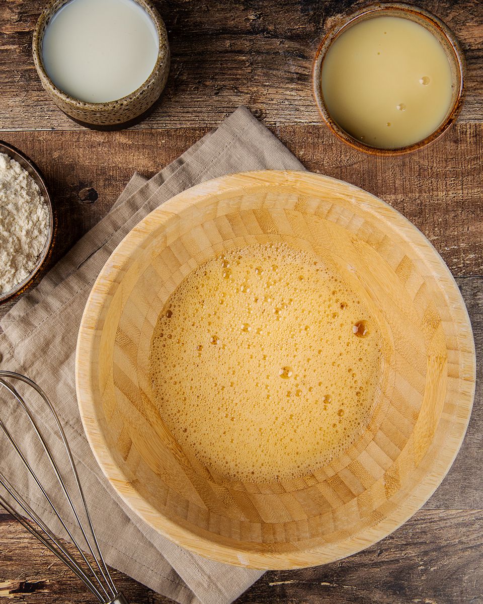 Духовку разогреть до 220°С. В миске взбить яйца, сгущенное молоко, молоко, корицу и кардамон. Добавить просеянную муку и замесить тесто.