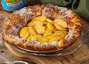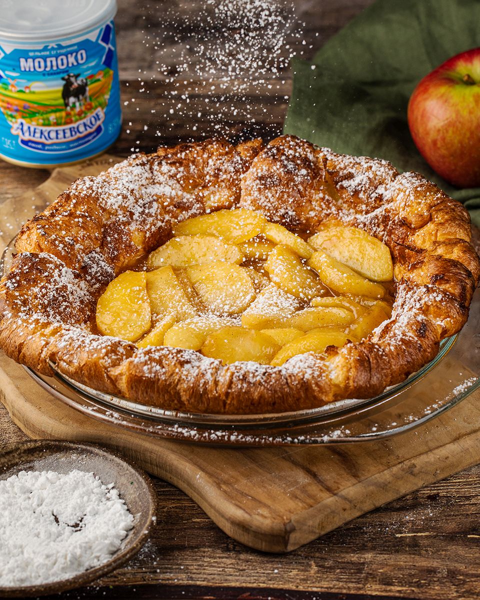 Блин вынуть из духовки, выложить в его центр яблочный топпинг. Сбрызнуть лимонным соком, посыпать сахарной пудрой и подавать.