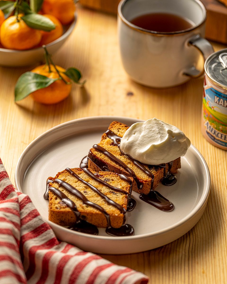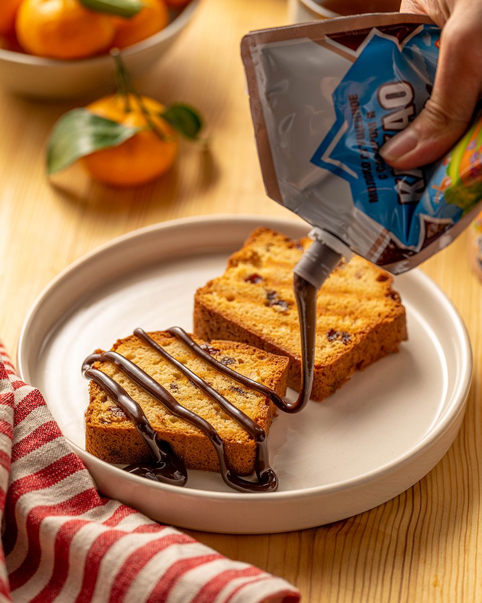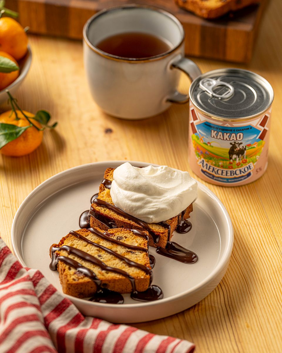 Выложить гренку на тарелку. Полить сгущенным какао.