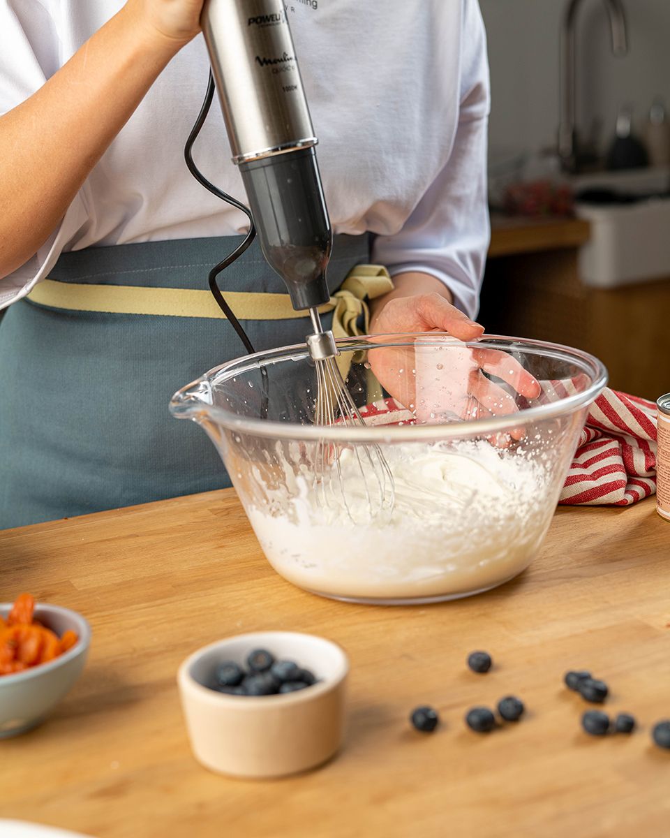 Холодные сливки взбить до пышности. Добавить сахарную пудру.