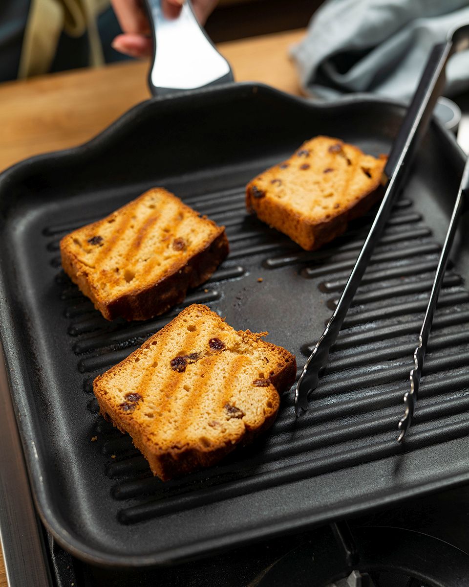 Ломтик кекса подсушить на сковороде или сковороде-гриль.