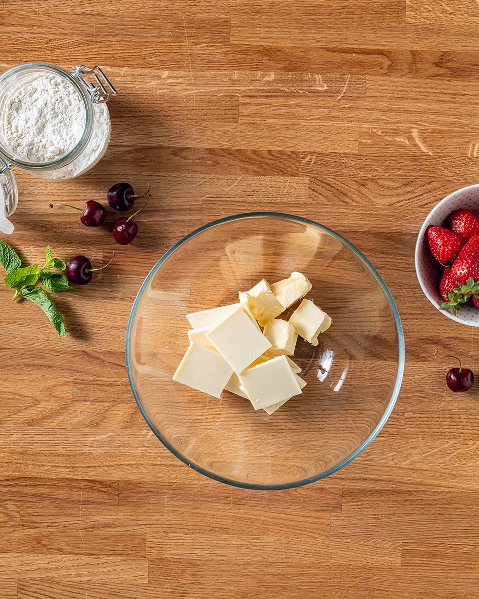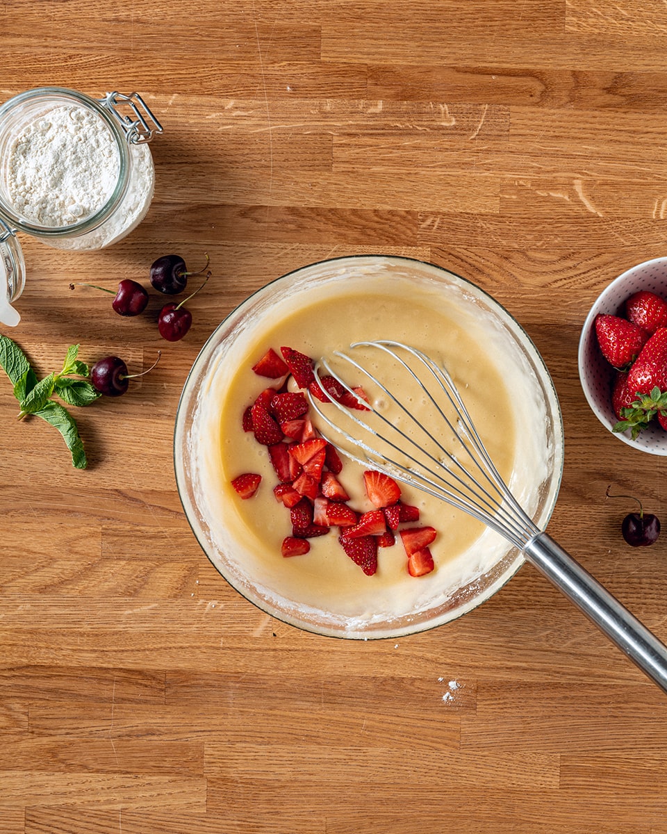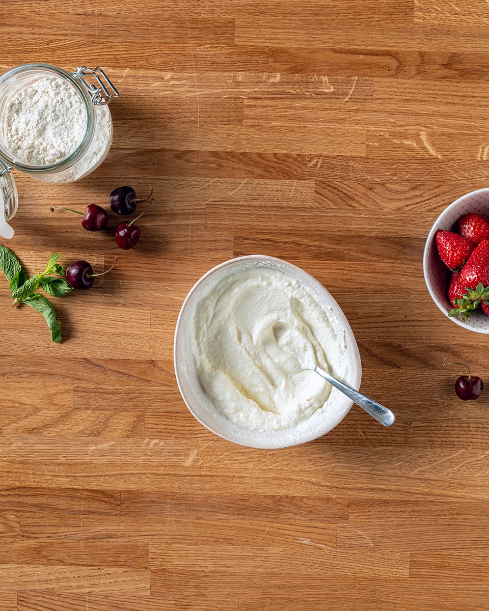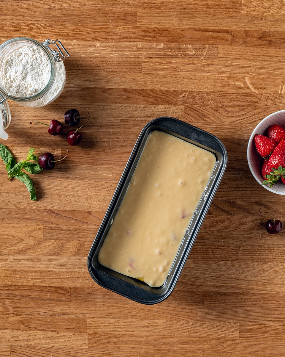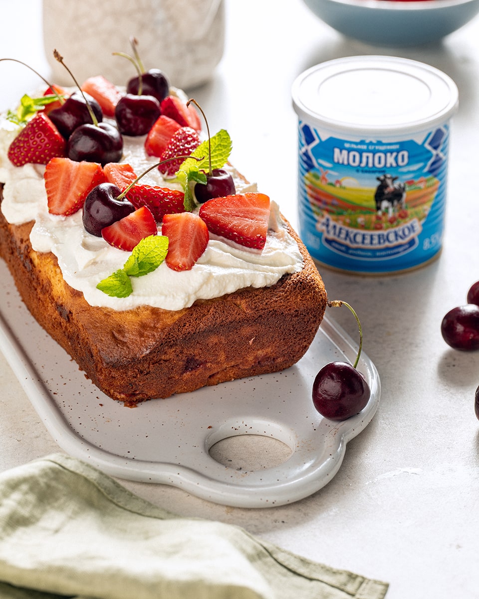 Готовый кекс остудить до комнатной температуры. Сверху смазать кремом из творожного сыра, украсить черешней, клубникой и листиками мяты.