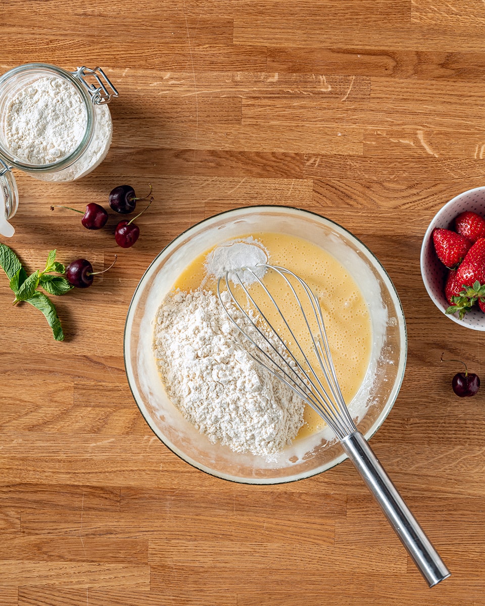 Добавить к этим ингредиентам сгущенное молоко и яйца. Взбить венчиком до гладкости. Всыпать муку, разрыхлитель и тщательно перемешать.