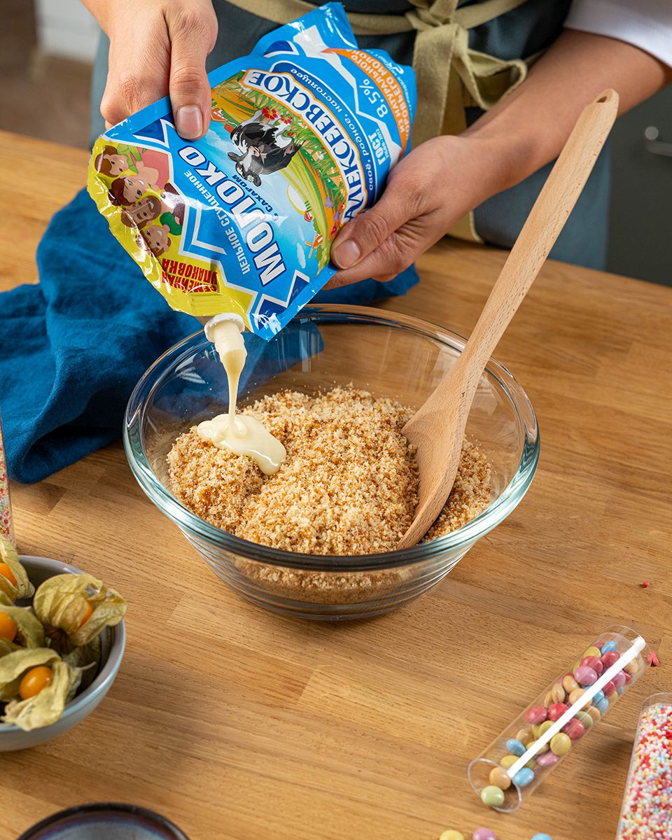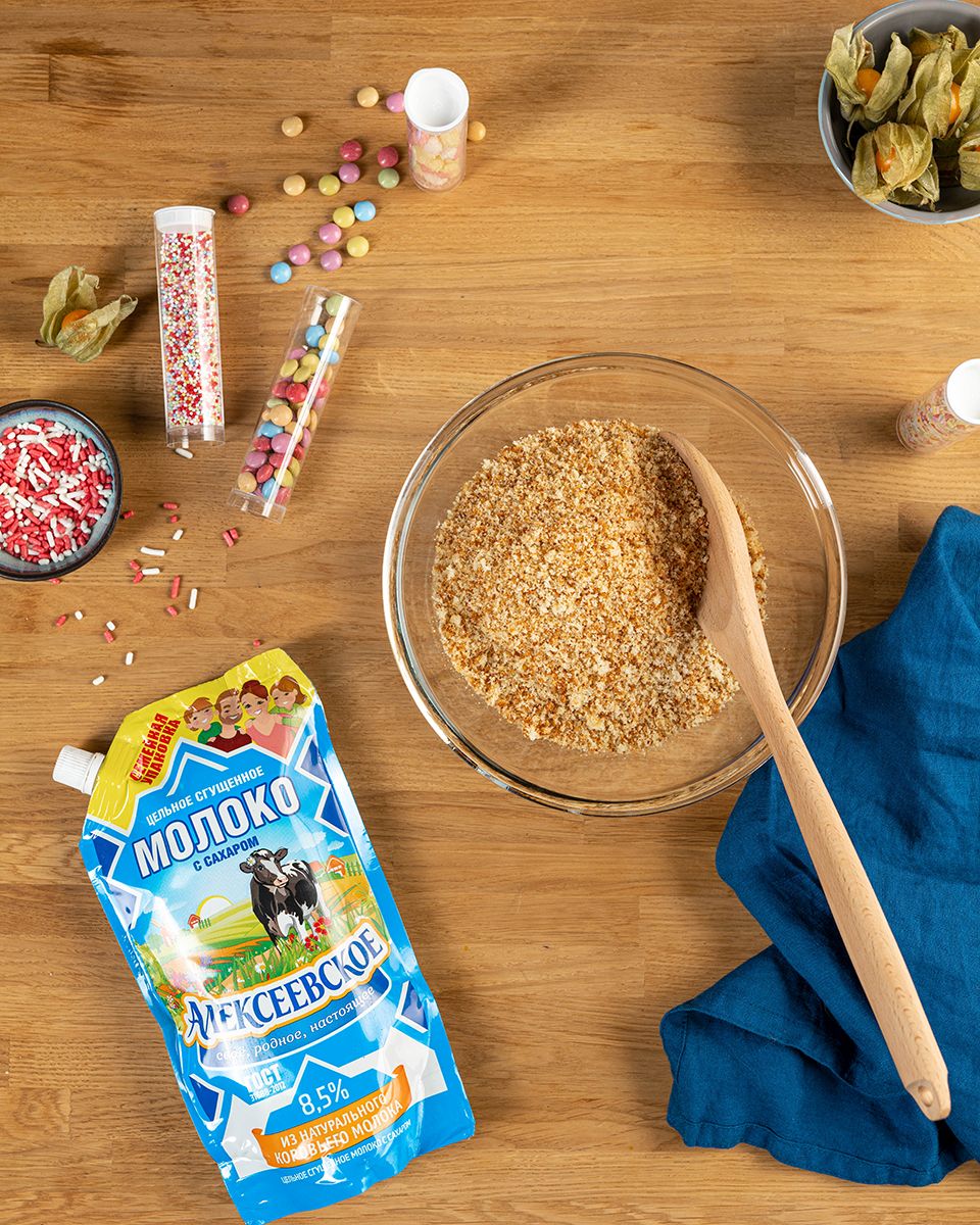 Смешать получившуюся крошку со сгущённым молоком и сформировать маленькие шарики.