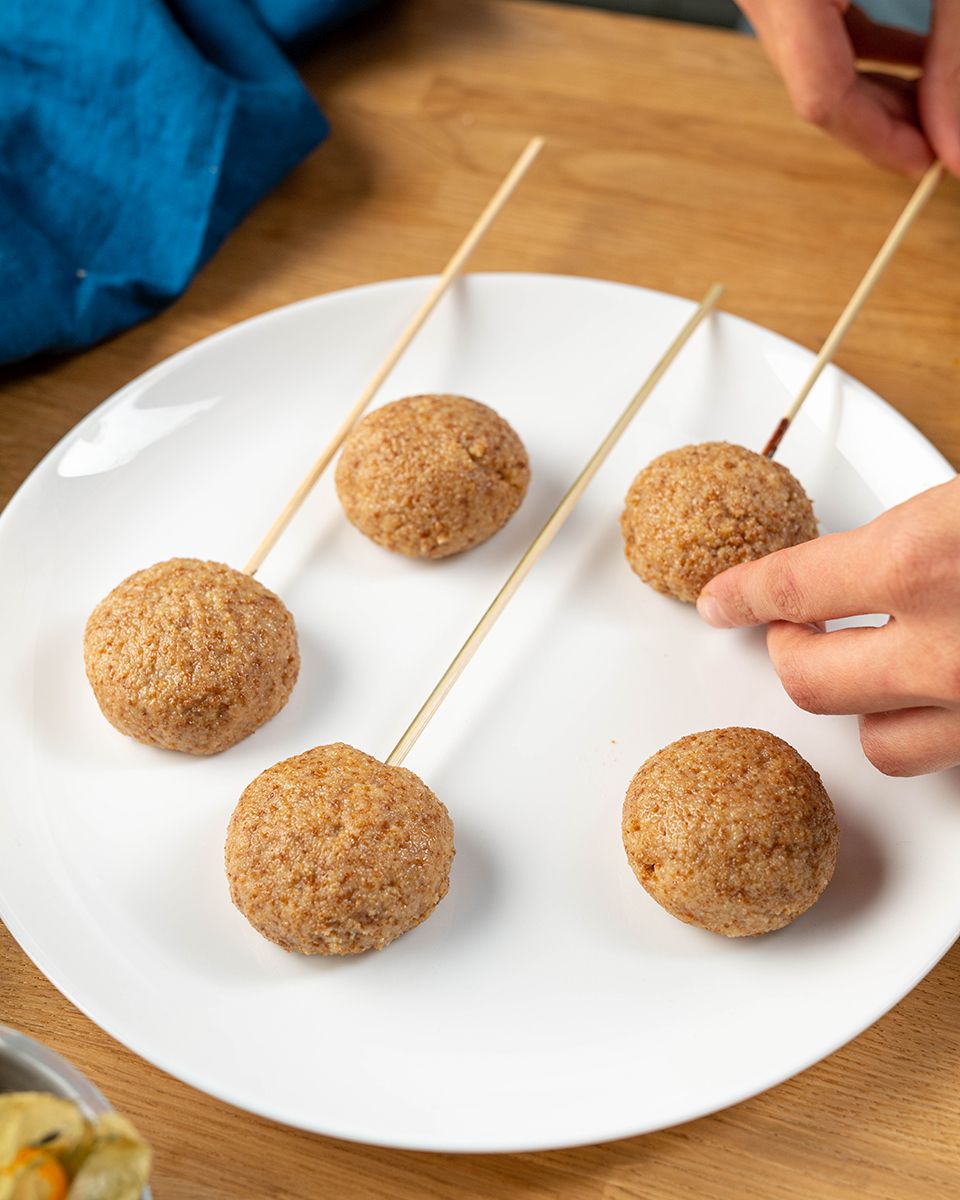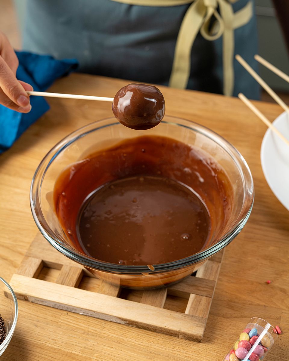 Деревянные палочки обмакнуть немного в шоколад и вставить в каждый шарик из бисквита. Убрать в морозилку на 15 минут. Шоколад снова поставить на водяную баню, чтобы он не застыл.