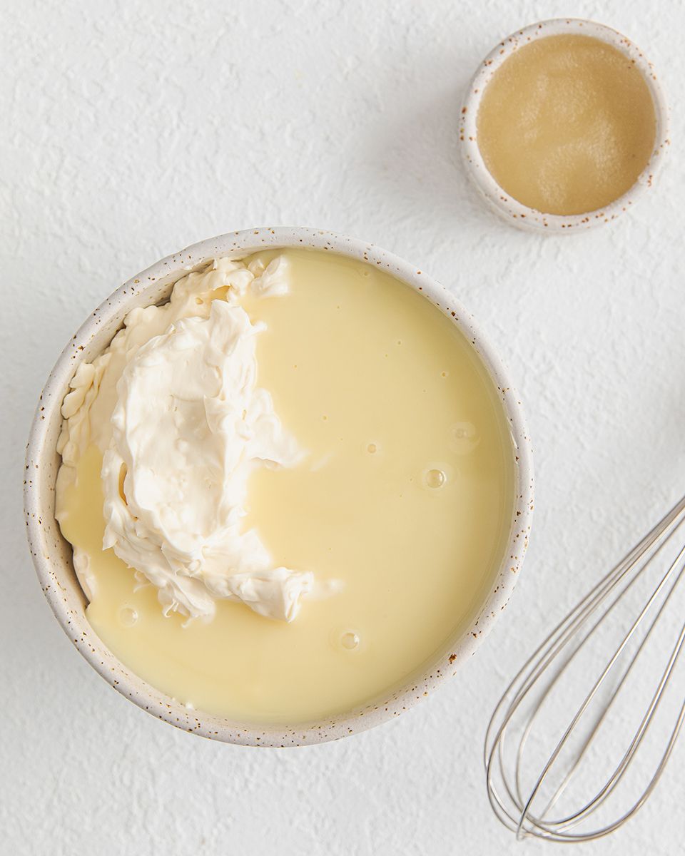 Смешать сливочный сыр и сгущенное молоко. Взбить до однородного состояния миксером. Постепенно ввести сок лимона и взбить миксером еще раз.