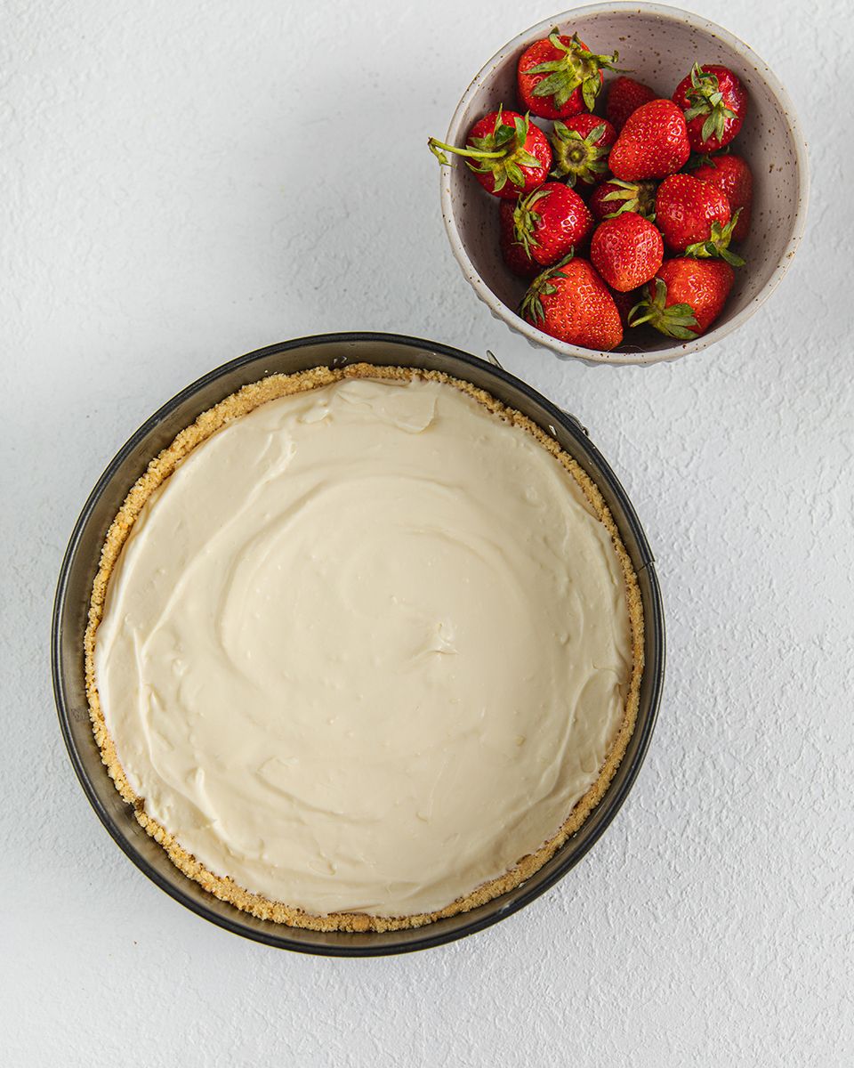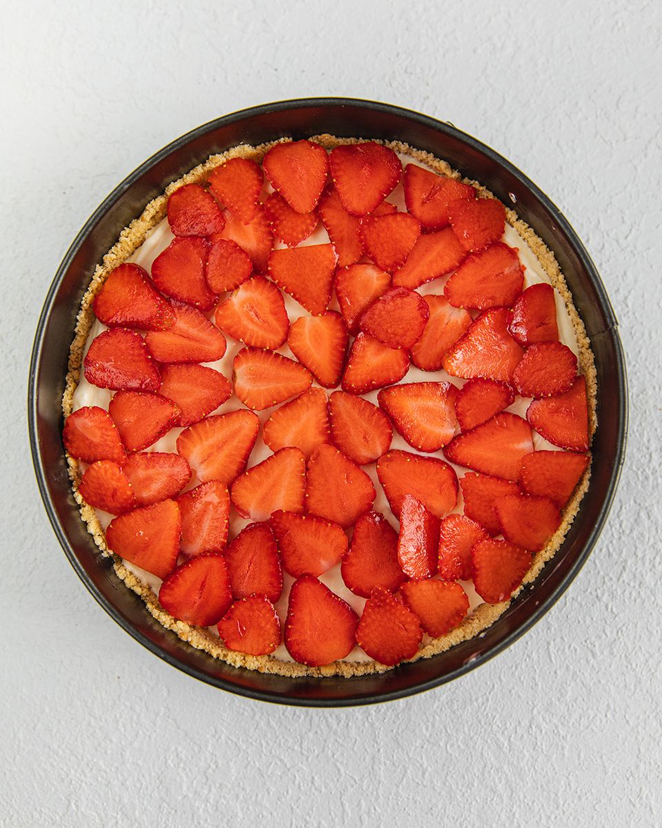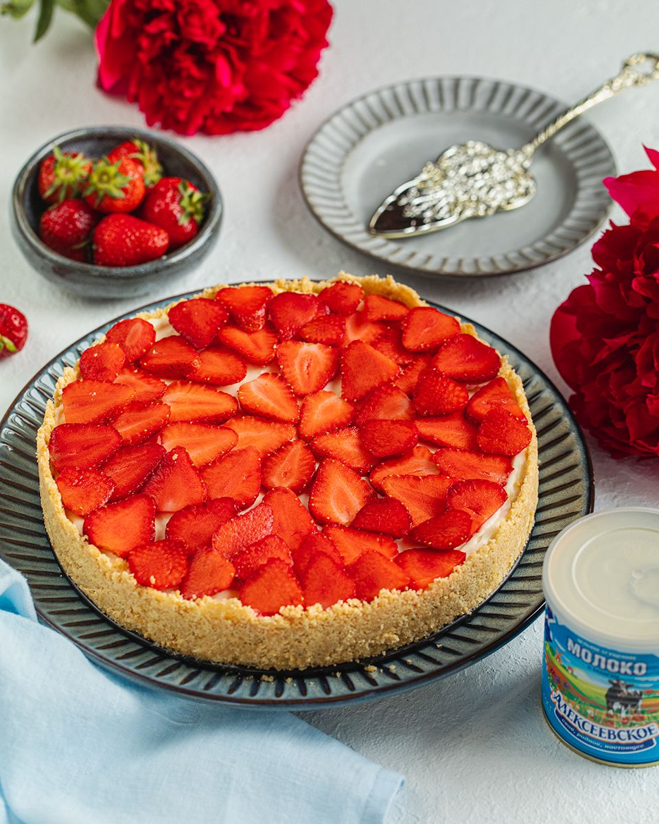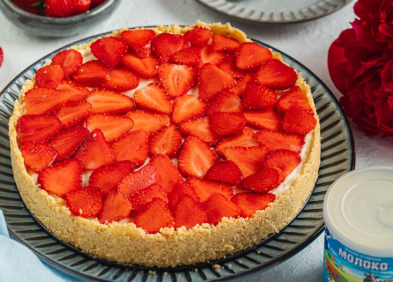 Клубнику помыть, высушить, порезать на тонкие дольки. Украсить пирог и поставить десерт охлаждаться в холодильник на час.
