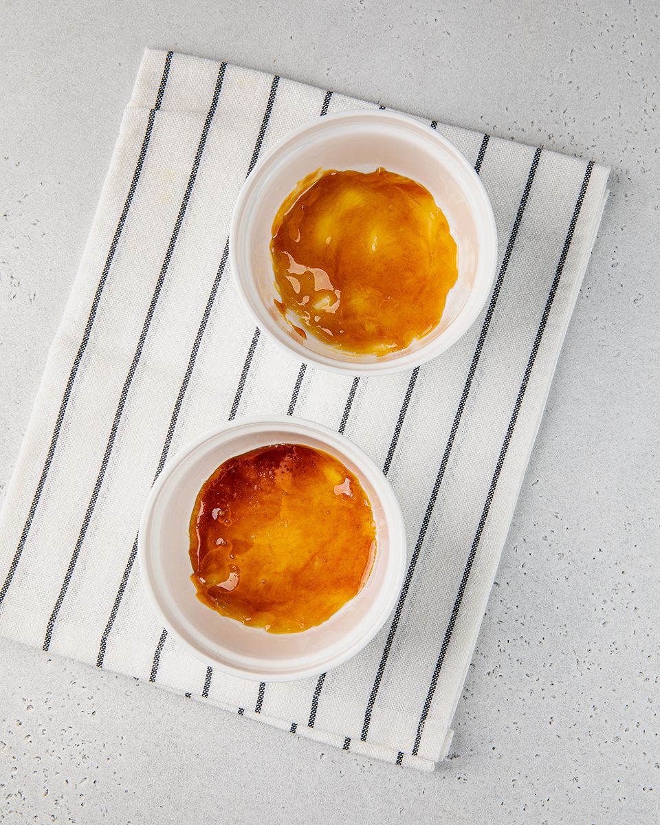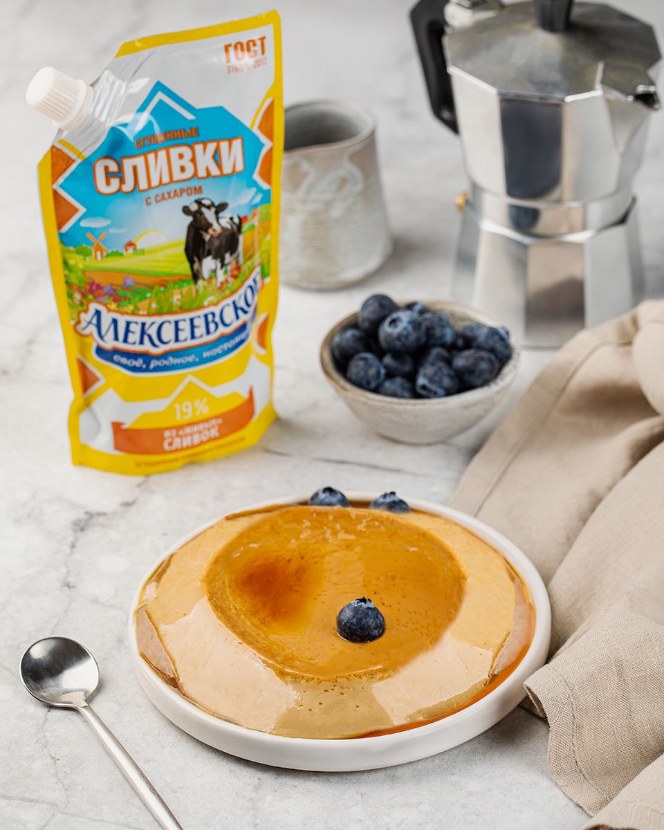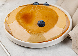 Влить приготовленный крем на застывшую карамель и сразу отправить в духовку. Выпекать флан примерно 70-80 минут на водяной бане при 160°С, поставив в духовку на среднюю полку. (Флан можно считать готовым, когда яичная смесь превратится в упругую желеобразную массу.) Готовый флан убрать в холодильник не менее, чем на 8 часов, но не замораживать.