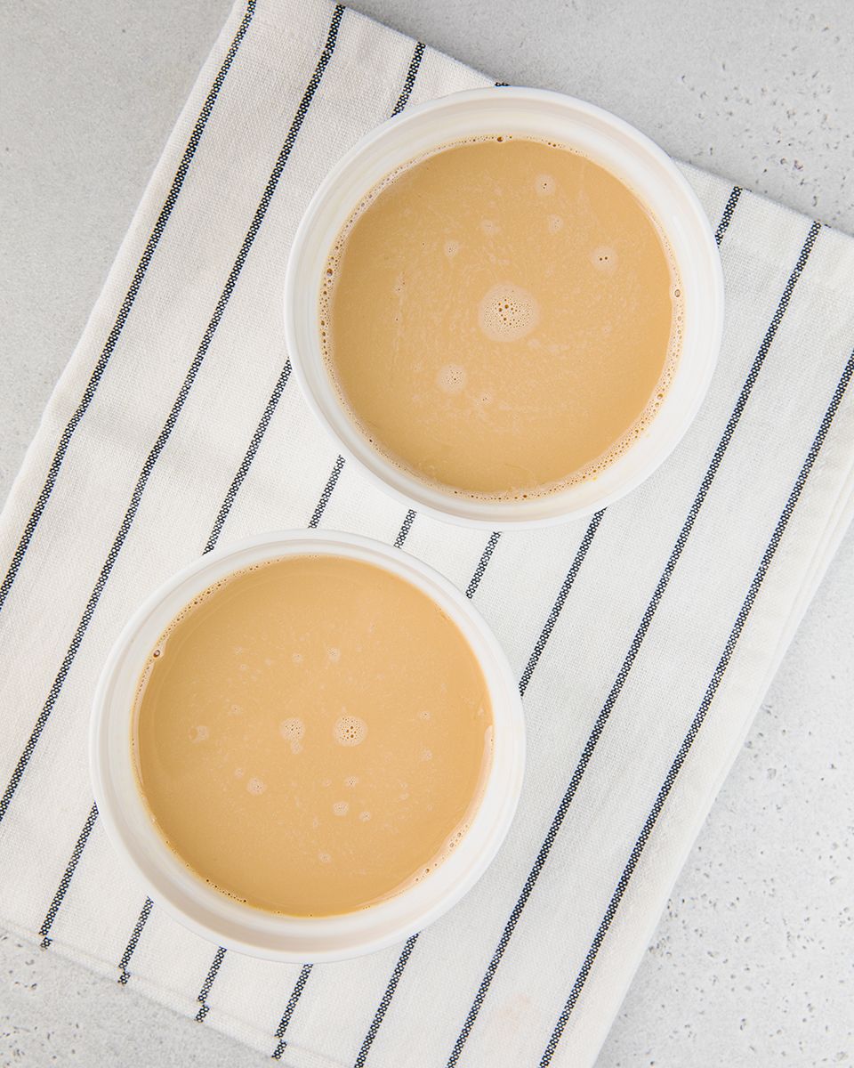 Когда сахар приобретет темно-янтарный оттенок, быстро перелить карамель в разогретую форму для выпечки. Равномерно распределить. Дать остыть и поставить в холодильник на 10-15 минут. Кофе растворить в горячей воде (4 ст.л.), немного остудить и смешать в блендере с молоком, сгущенными сливками, яйцами, ванилью и солью.