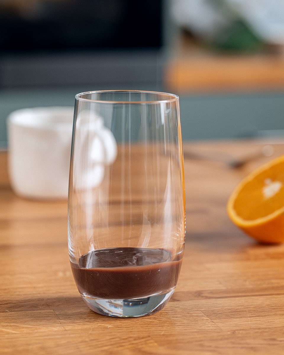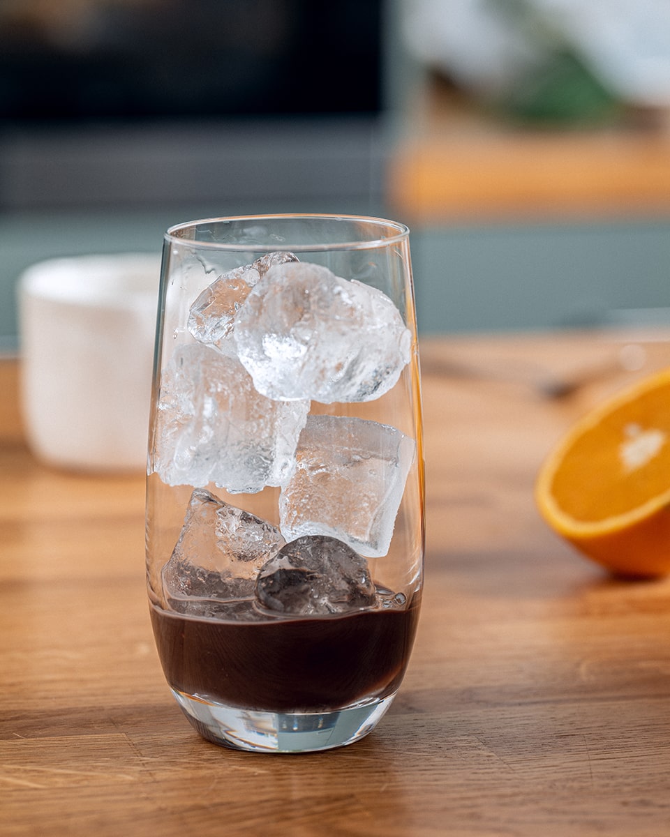 Влить эспрессо 50 мл (сваренный в турке подойдет так же). Украсить бокал долькой апельсина.