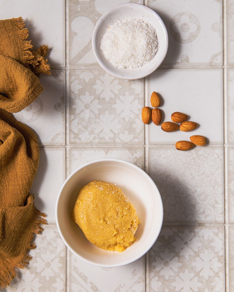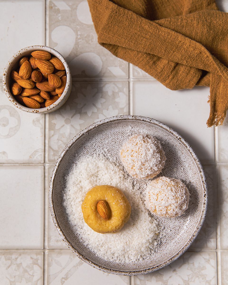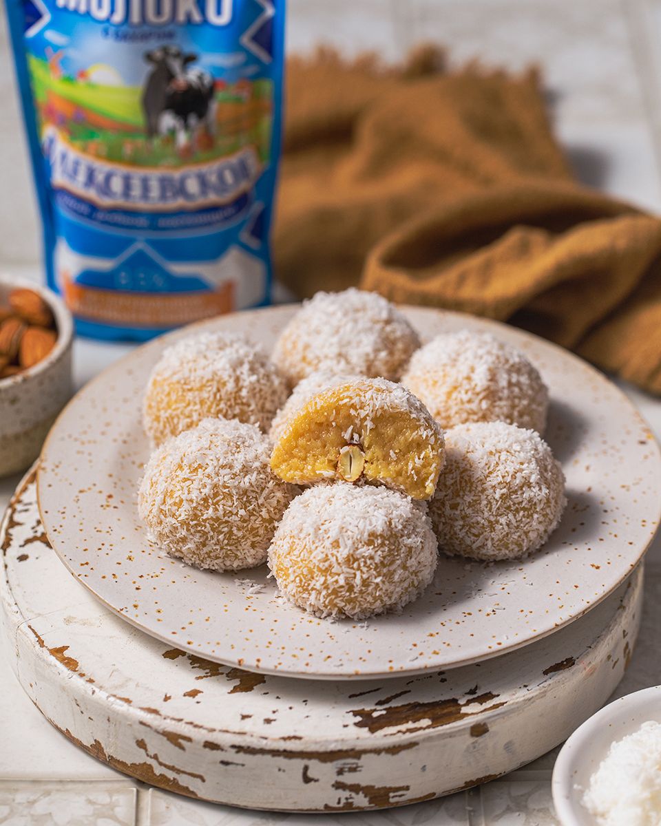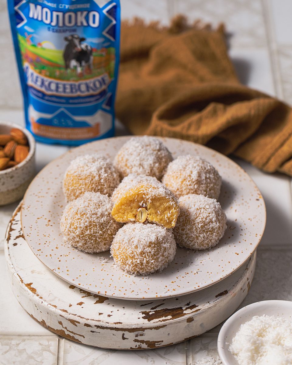 Слепить небольшие шарики размером с маленькую сливу, сплющить их, на середину положить миндаль. Опять слепить шарик. Каждый шарик обвалять в кокосовой стружке и выложить на плоскую тарелку.