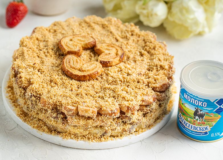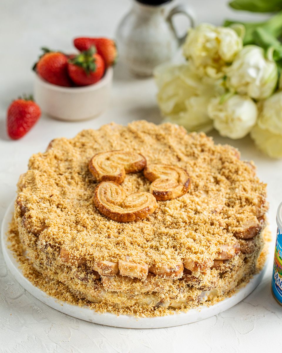 Переложить торт на блюдо, украсить крошкой из печенья и убрать в холодильник на несколько часов (можно на ночь) для пропитывания.