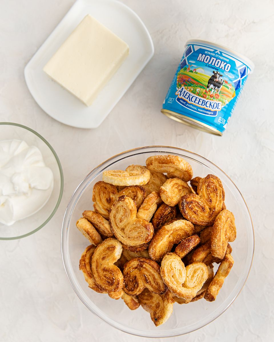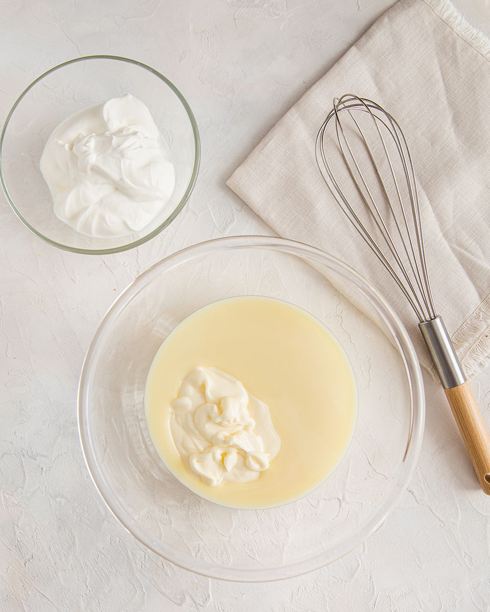 Подготовить крем. В миске смешать сгущенное молоко со сметаной, добавить сливочное масло и взбить массу венчиком до однородной консистенции.