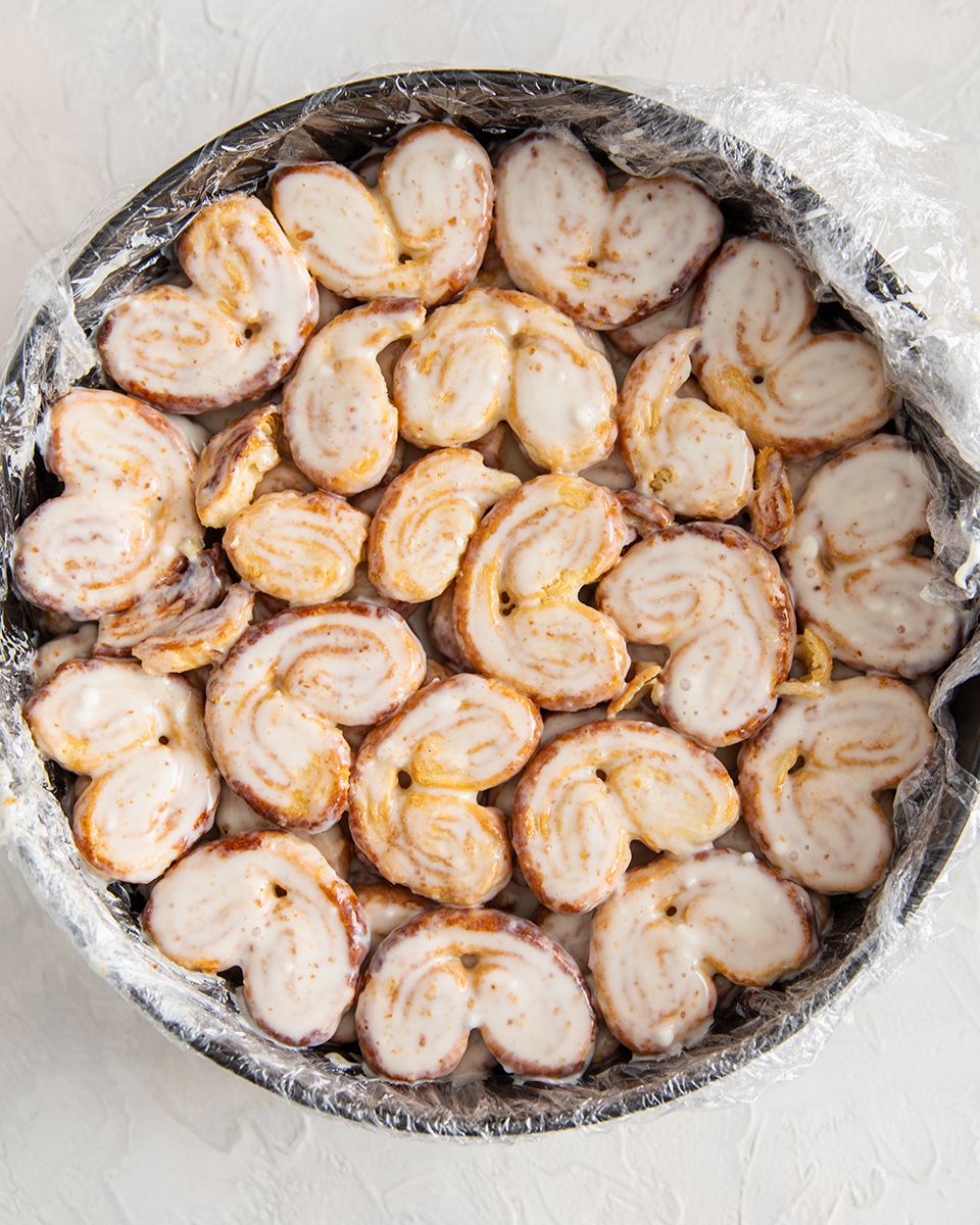 Бортики формы обтянуть пищевой пленкой. Несколько штук печенья измельчить до состояния крошки (она понадобится для украшения).