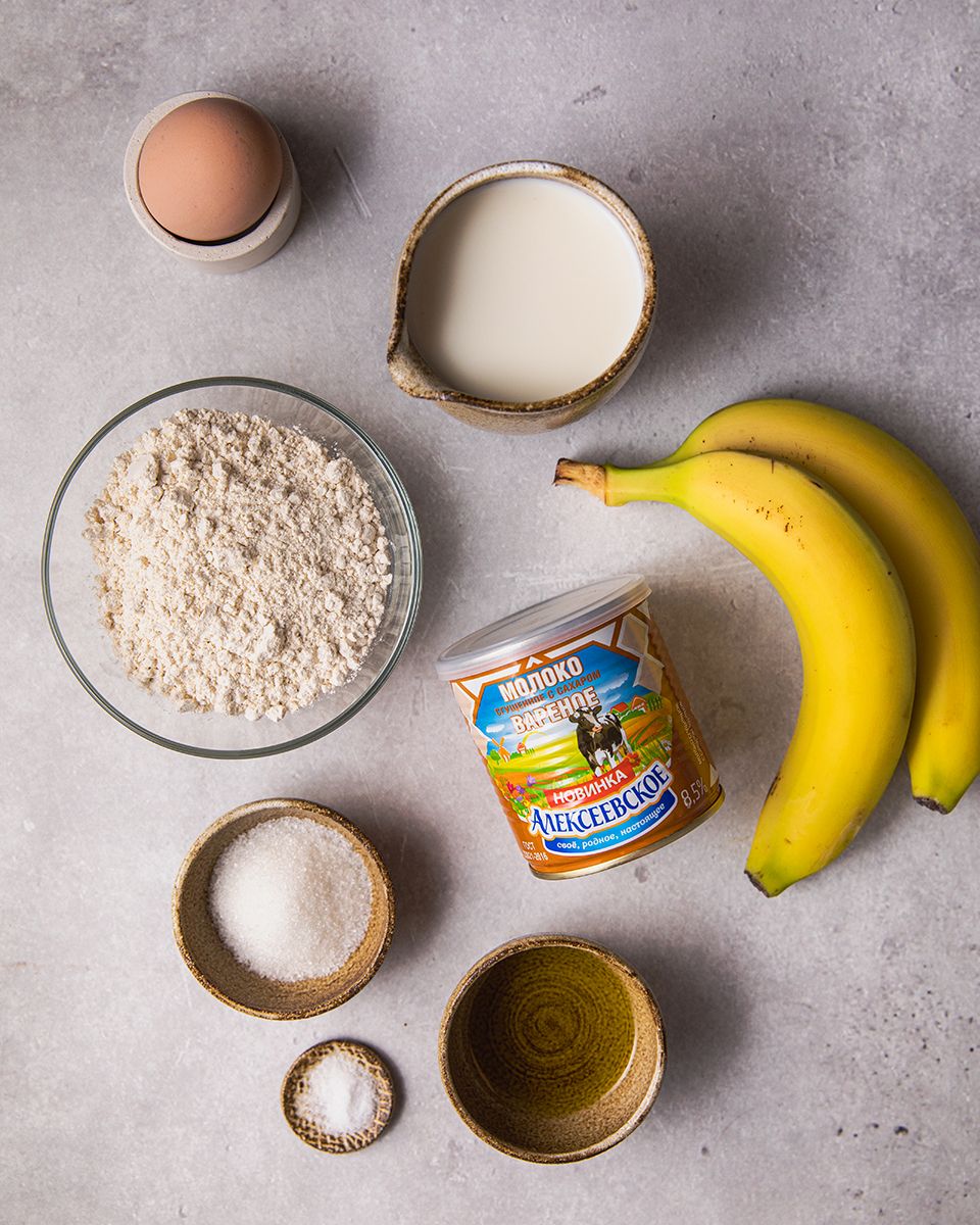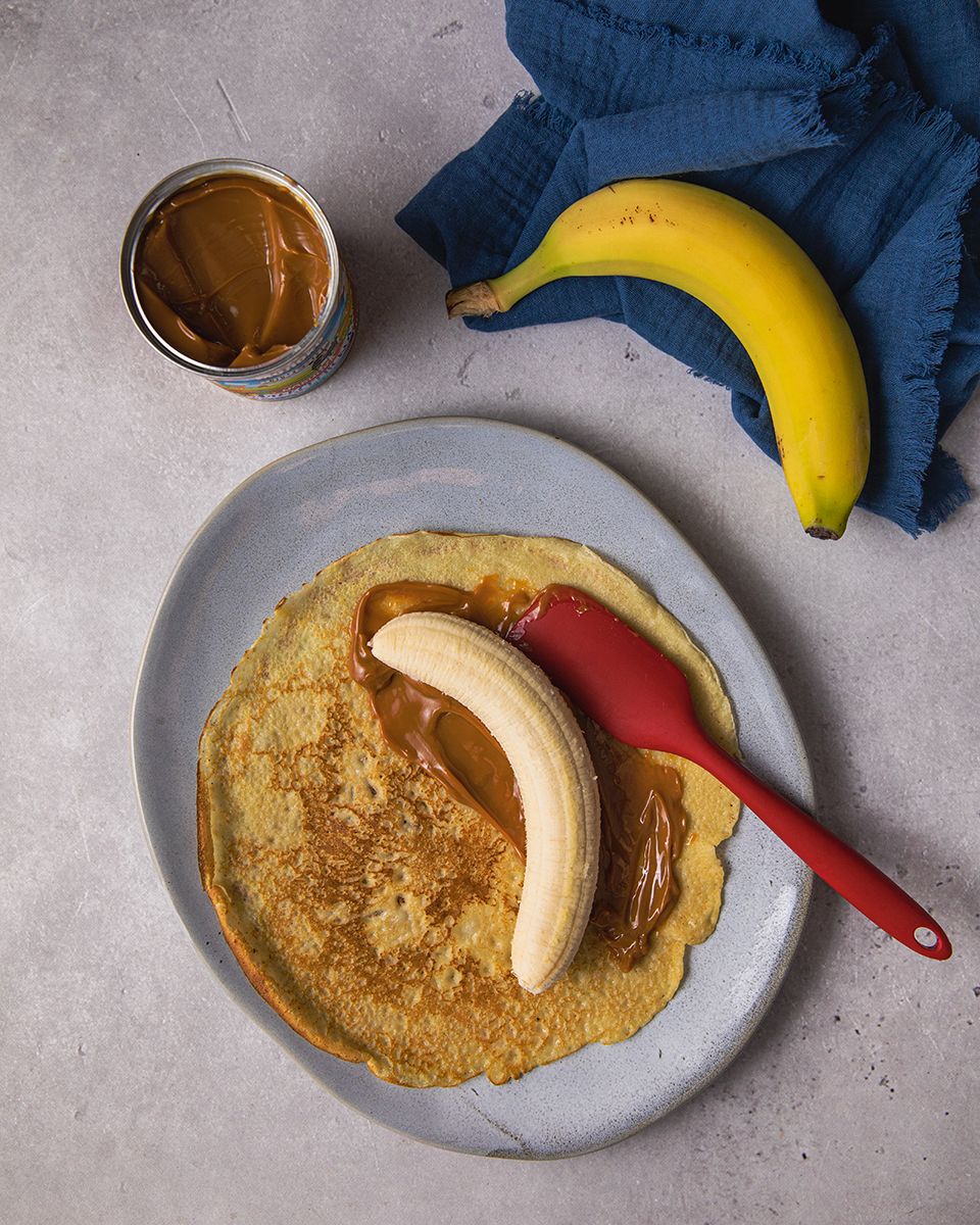 Каждый блинчик смазать слоем вареного сгущенного молока, положить очищенный банан и свернуть трубочкой.