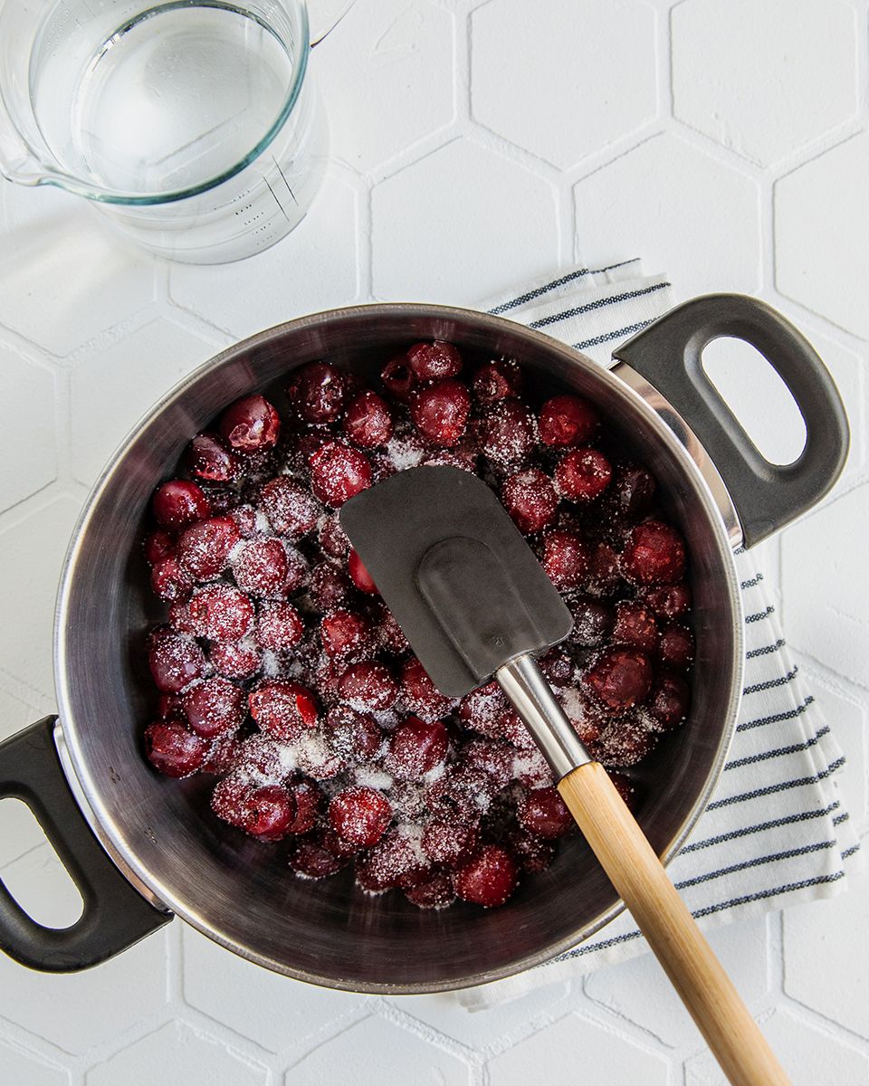 Для супа удалить у черешни косточки и плодоножки. В сотейнике довести до кипения воду, добавить сахар по вкусу, разломанные палочки корицы и черешню. Варить при очень бурном кипении 2–3 мин., очень нежно помешивая, чтобы не разрушить ягоды.