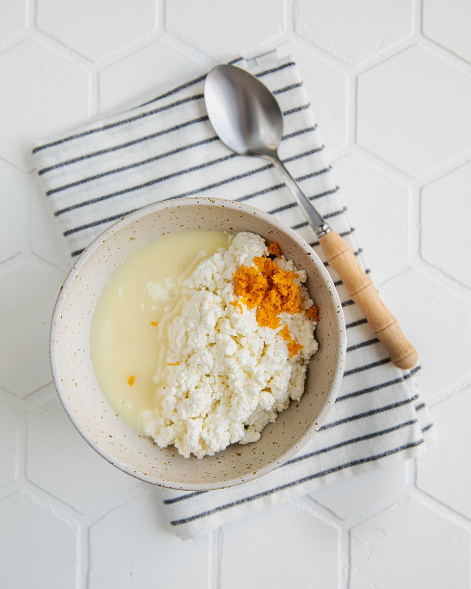 Для мусса необходимо измельчить цедру. Смешать творог, сгущённое молоко и цедру.