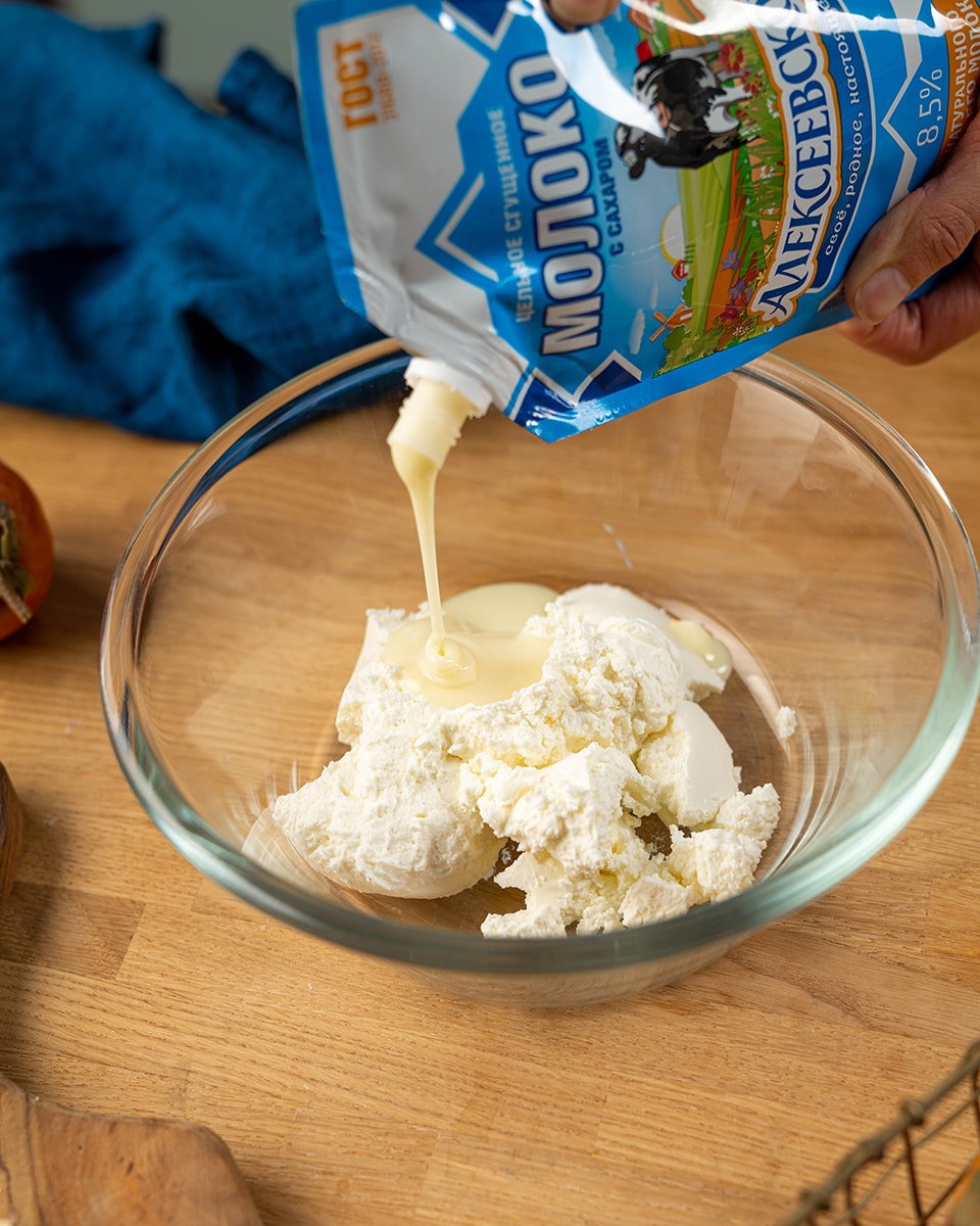 Творожный сыр комнатной температуры смешать со сгущенкой.
