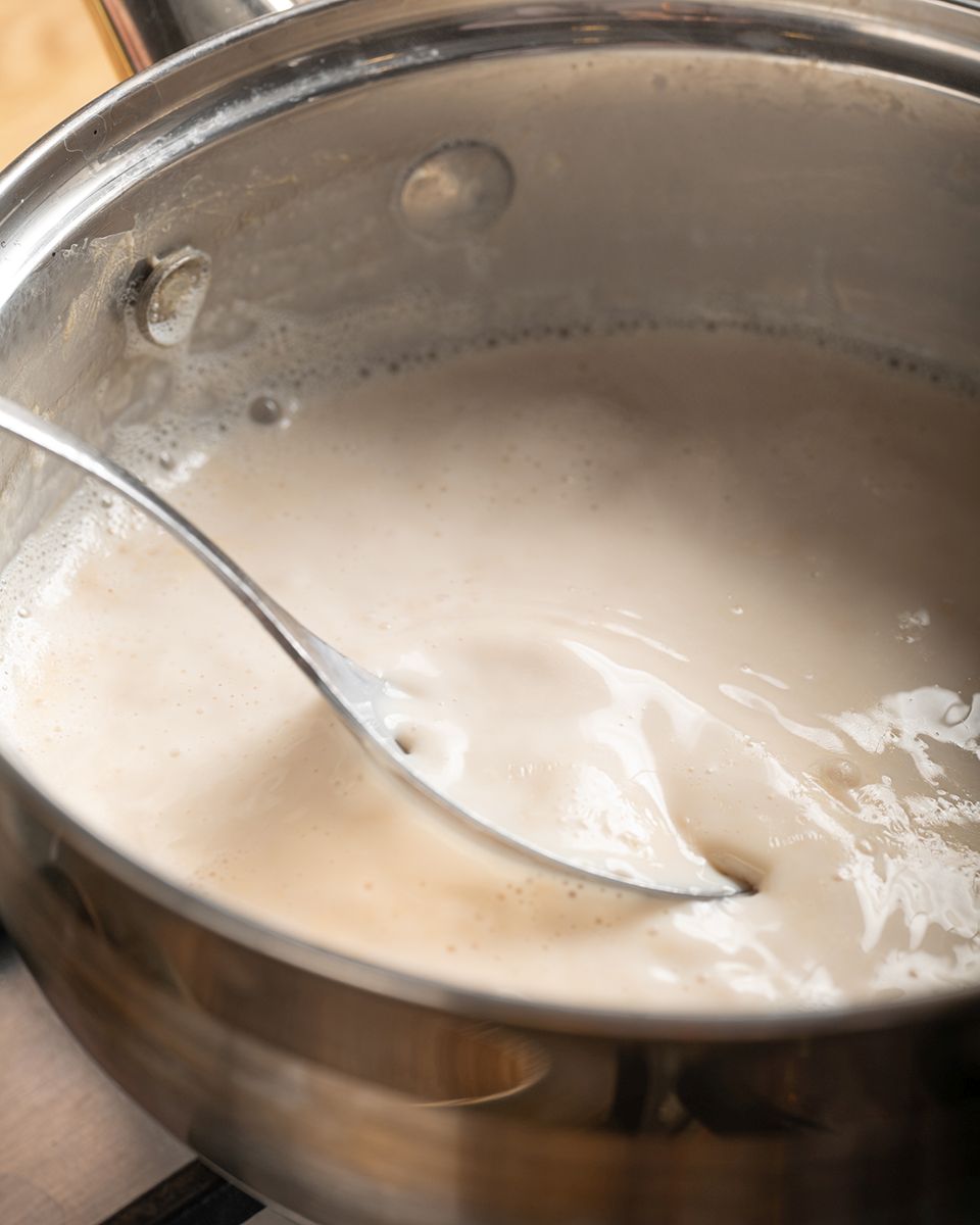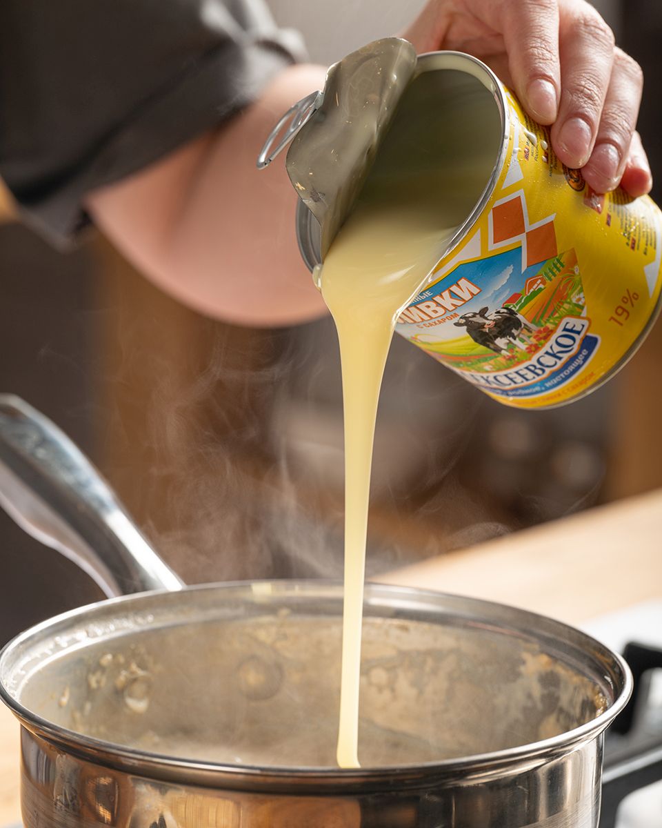 Молоко вылить в сотейник, уварить вдвое.