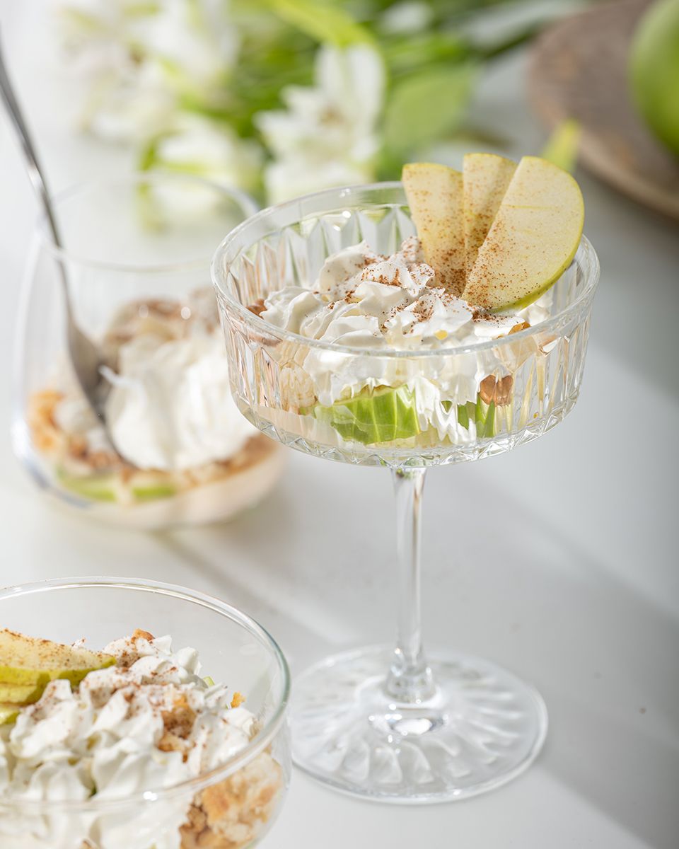 Сверху покрыть трайфл взбитыми сливками. Украсить ломтиками яблок и корицей.