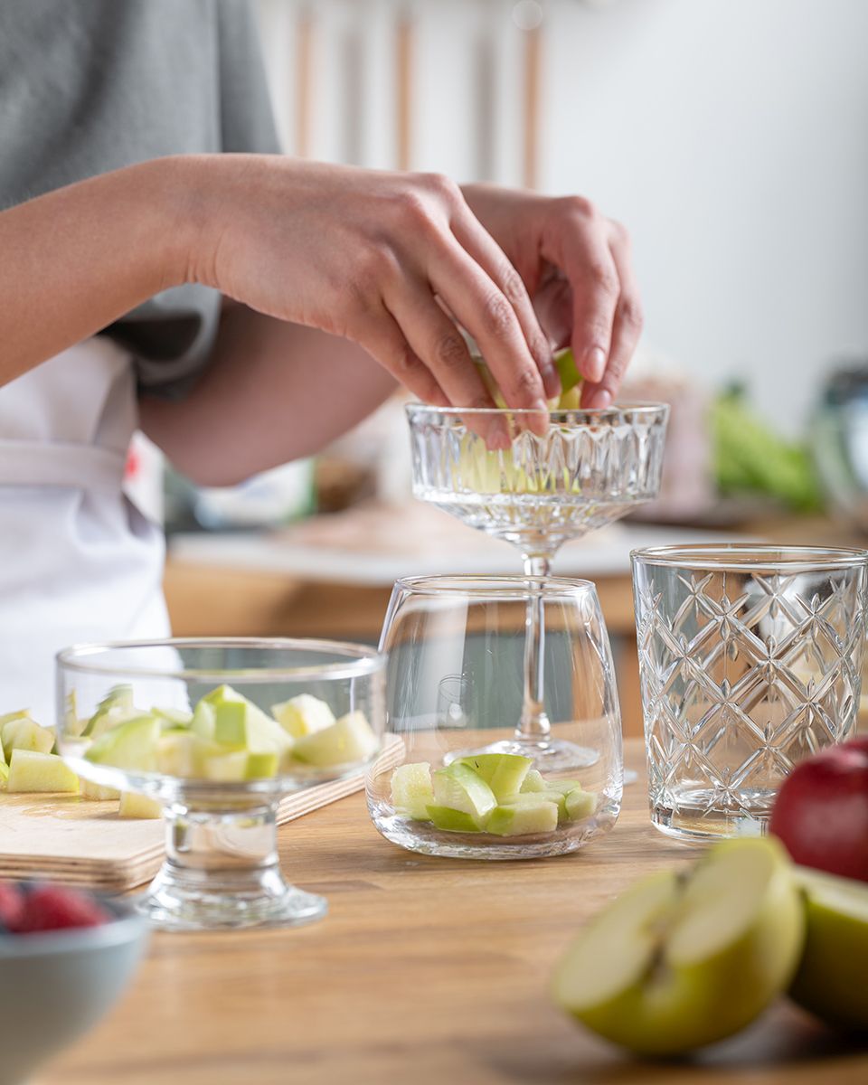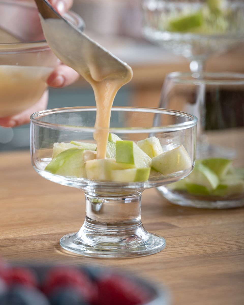 Зеленые яблоки нарезать кубиками. Разложить по креманкам.