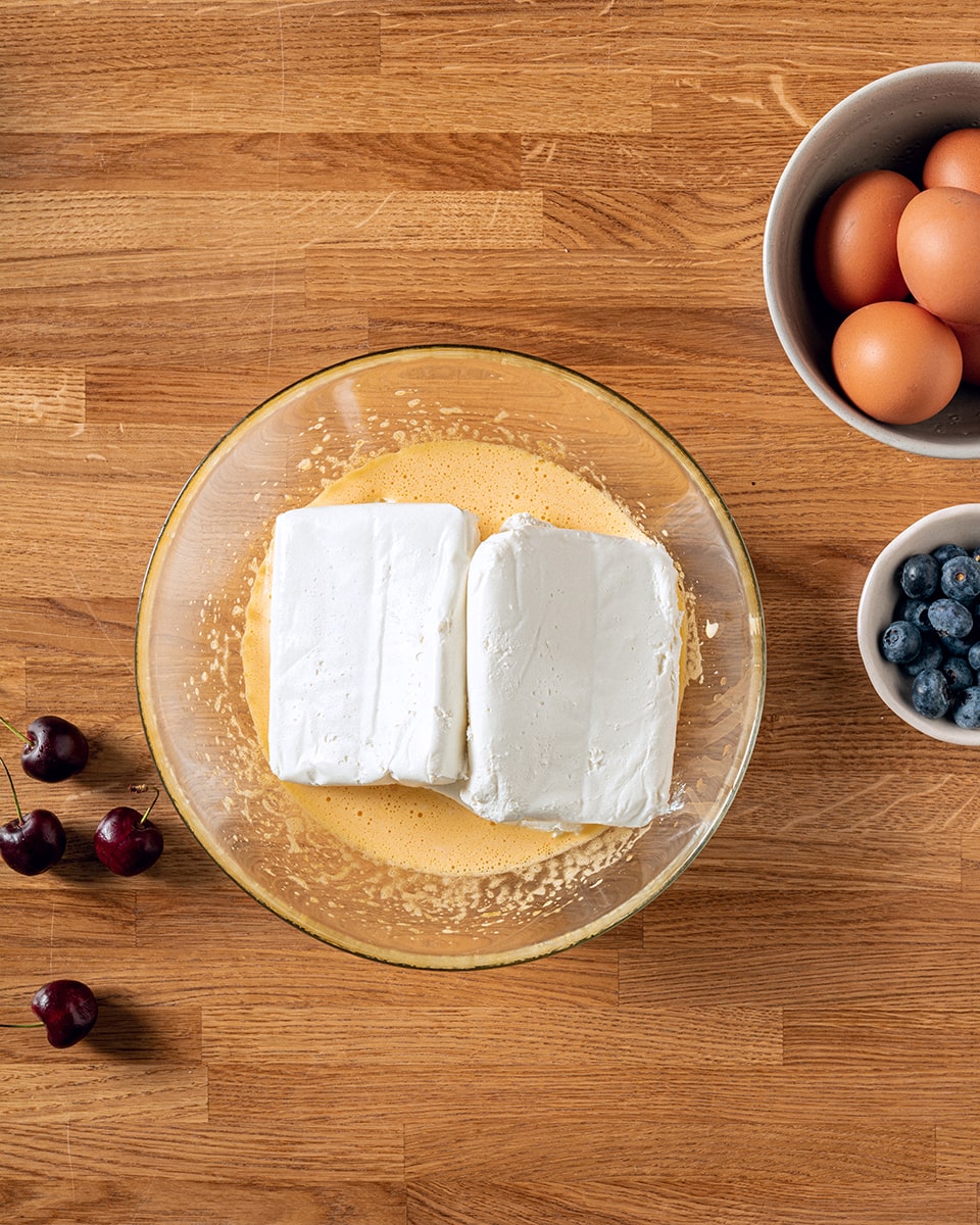 К творогу добавляем смесь из желтков, сгущенные сливки и манную крупу. Все взбиваем при помощи ручного блендера.