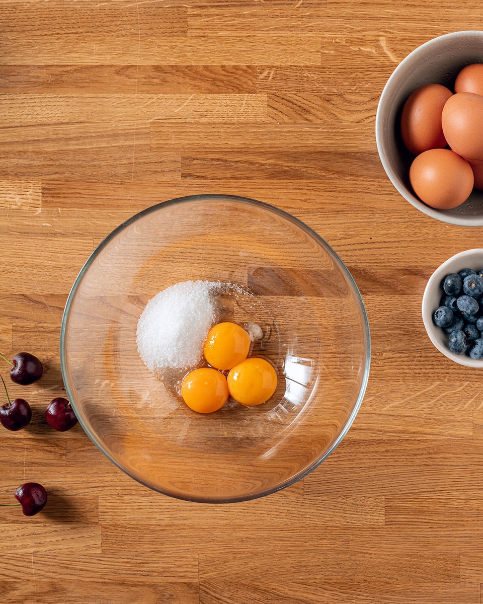 Отделяем белки от желтков. К желткам добавляем половину сахара.