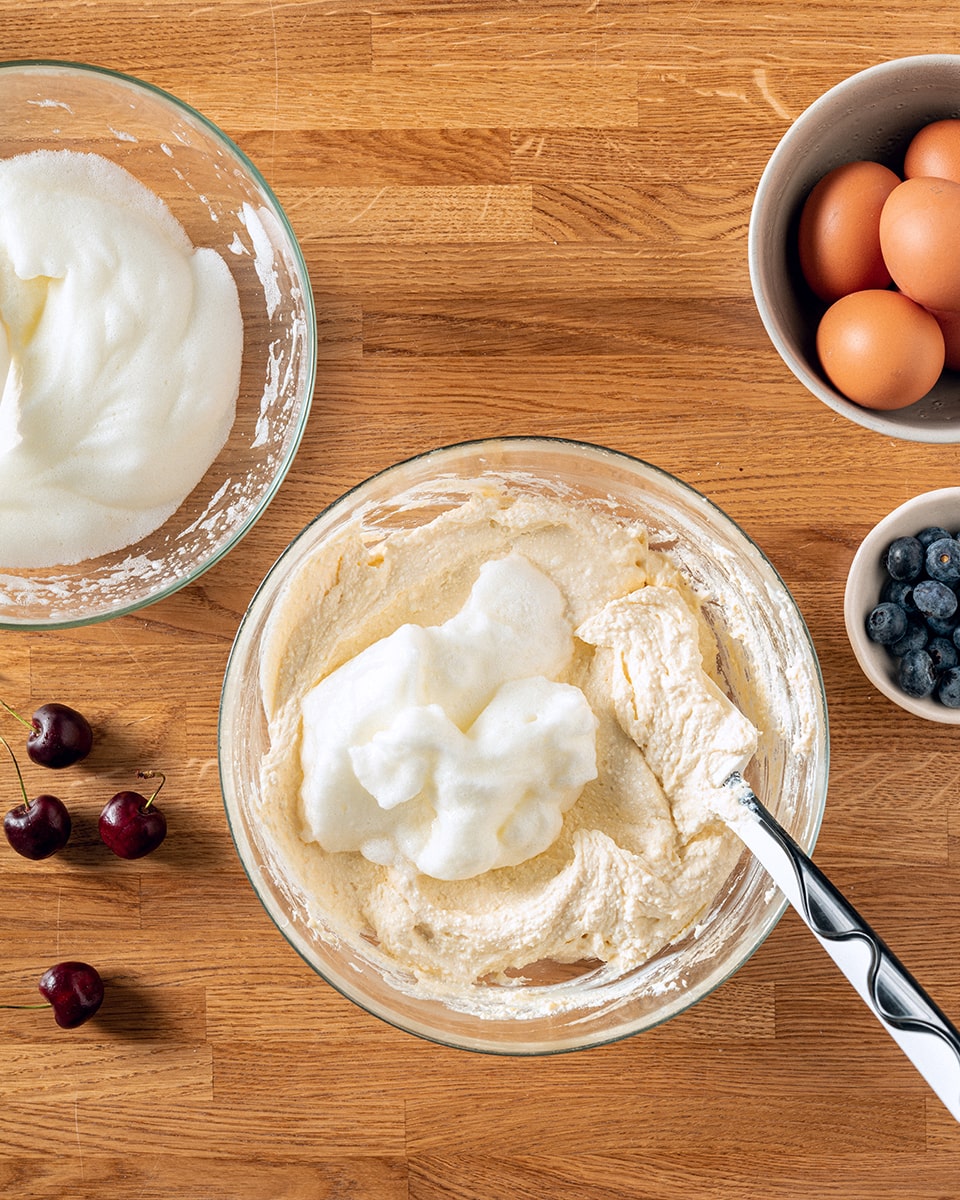 Добавляем к творогу взбитые белки. Аккуратно перемешиваем белки с творогом снизу вверх. Тесто для запеканки готово. Обильно смазываем форму для запекания сливочным маслом и посыпаем манной крупой.