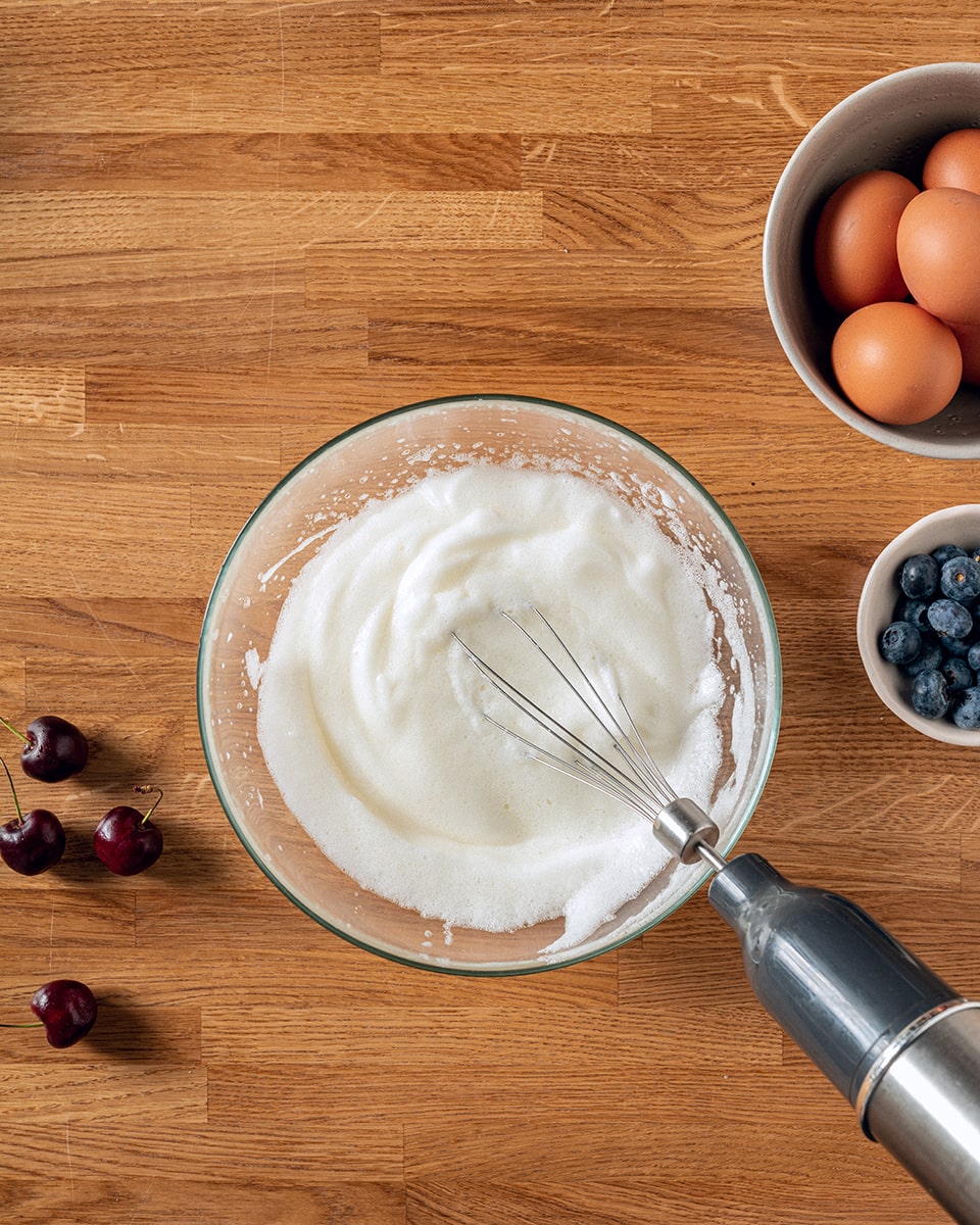 Белки взбиваем миксером со щепоткой соли. Когда белки взобьются в пенку, добавляем остальной сахар и взбиваем до пиков.