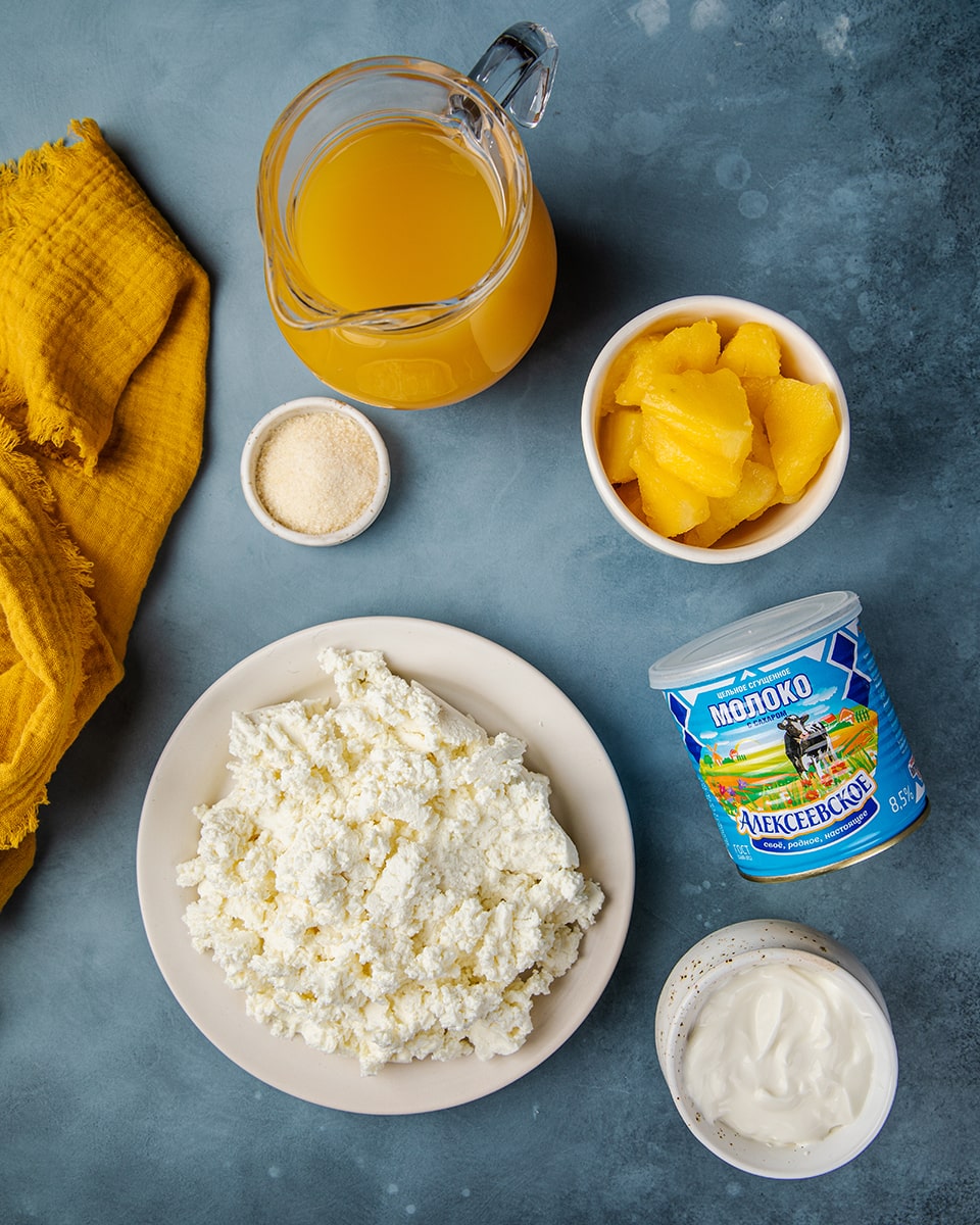 Желатин растворить в течение 40 минут в ананасовом соке (к нему же добавить и жидкость из ананасовых кубиков). Творог взбить со сметаной, ванилином и сгущенным молоком.