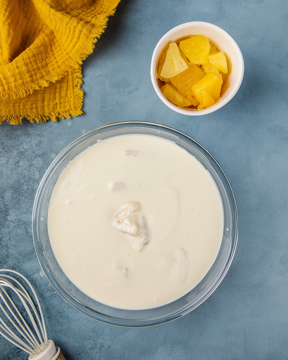 Разбухший желатин растворить на медленном огне, не доводя до кипения, смешать со сметанно-творожной массой и добавить кубики ананаса.