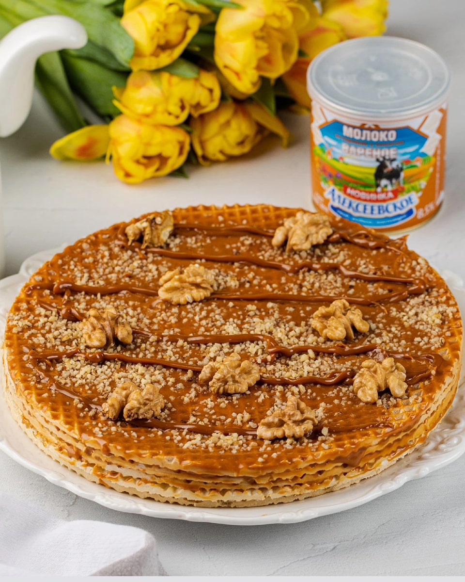 Собрать торт. Коржи смазывать кремом, и каждый второй корж посыпать орешками. Верхний корж пока не смазывать кремом. Поставить на него груз и убрать на 1-2 часа в холодильник.