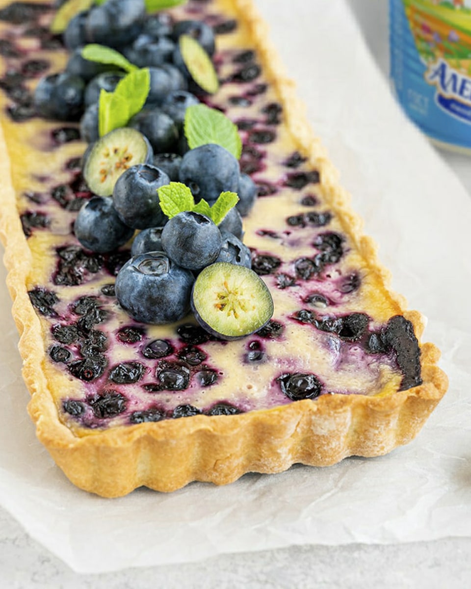 Сборка и выпечка. Форму с тестом вынуть из морозилки. Влить подготовленную начинку. Поставить в духовку, предварительно прогретую до 180°С, и выпекать около 45 минут. После выключить нагрев, оставить дверцу духовки открытой и подержать ватрушку еще 15-20 минут. Затем достать, дать окончательно остыть, украсить ягодами и листиками мяты.